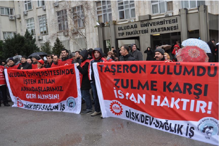 Bursa Uludağ Tıp Fakültesi Hastanesi’nde yıllardır taşeron şirketler aracılığıyla çalıştırılan sağlık işçilerinin muvazaalı (hileli) çalıştırıldığı ve hastanenin asıl işçisi sayılması gerektiği yönündeki mahkeme kararları iki yıldır uygulanmamıştı. Bu duruma tepki gösteren Dev Sağlık-İş üyesi işçiler 29 Kasım günü gerçekleştirilen taşeron ihalesini protesto etmişti. Yüzlerce işçi ihalenin yapıldığı Rektörlük binasına girerek ihalenin gerçekleşmesi durumunda suç işleneceğini ilan etmişti. Bu eylemin ardından hastane yönetimi İş Kanunu’nun 25/2’nci maddesini dayanak göstererek Dev Sağlık-İş üyesi 17 işçiyi “tazminatsız” olarak işten atmıştı.