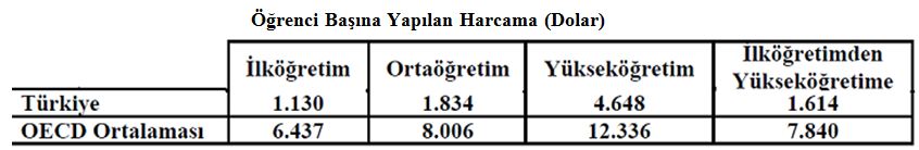 OECD ülkelerinde öğrenci başına yapılan harcama ilköğretimde yıllık 5.447 dolar, ilköğretimde 6.741 dolar, ortaöğretimde 8.267 dolar, yükseköğretimde 12.709 dolar iken; Türkiye’de ilköğretimde 1.130 dolar, ortaöğretimde yıllık 1.834 dolar, yükseköğretimde ise 4.648 dolardır.