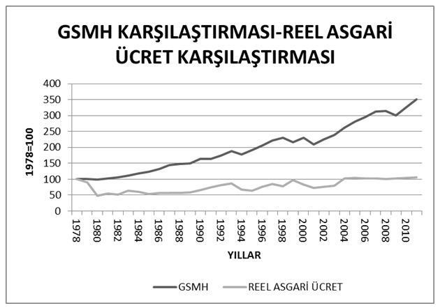 Asgari ücretin uzun gelişme seyrine bakıldığında 34 yıllık bir dönem için (1978 yılından bu yana) ekonomi (1977-2006 GSMH ve 2007 sonrası GSYİH) sabit fiyatlarla 3,7 kat büyürken, asgari ücretin % 9’luk gelişme ile neredeyse yerinde saydığı görülmektedir.