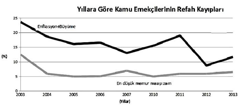 10 yılda kamuda çalışan işçilerin ise net gelirleri yüzde 30 erimiştir. Kamuda çalışan işçilerin ortalama kaybın da altında bir refah kaybına uğraması, bugün iş ve ücret güvencemizi ortadan kaldırmaya dönük sürdürülen; kadro esasına dayanan memurluğun yerine sözleşmeli personel, geçici personel ve işçilerin istihdam edilmesini hızlandıran kamu personel anlayışının, şimdiden bir sonucudur. Daha düşük ücret politikası, hükümetin üzerinde çalışmalarını sürdürdüğü 657 sayılı DMK ile varmak istediği noktadır.