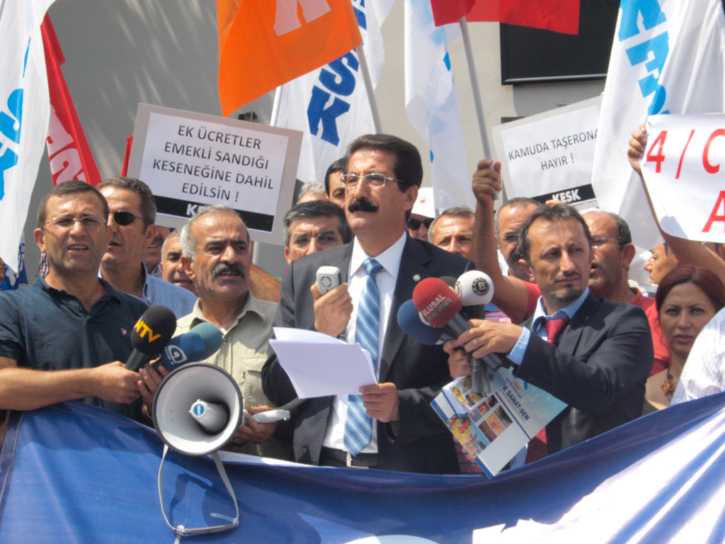 2014-2015 TİS görüşmeleri 1 Ağustos 2013 (bugün) tarihi itibarıyle başladı. Sürece ilişkin yaklaşımlarımızı ve taleplerimizi ifade etmek ve Konfederasyonumuz heyetini kitlesel olarak toplantıya uğurlamak üzere Sendikalarımızın Ankara şubeleri üye ve yöneticileri saat 11.00’de Milli Kütüphane yanı, TRT Arı Stüdyoları önünde toplandı. Ardından buradan TİS görüşmelerinin yapılacağı Çalışma ve Sosyal Güvenlik Bakanlığı önüne yürüyüş yapıldı. Bakanlık önünde DİSK’e bağlı EMEKLİ-SEN üyelerinin de katılımıyla Genel Başkanımız basına yönelik bir açıklama yaptı.