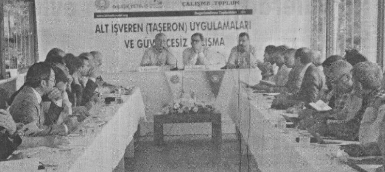Moderatörlüğünü Prof. Doktor Ahmet Selamoğlu’nun yaptığı toplantıda açılış konuşmasını yapan Birleşik Metal-İş Genel Başkanı Adnan Serdaroğlu, taşeronluk hükümetin taşeronluğu yaygınlaştıran politikalarına yönelik bilgiler verdi. Serdaroğlu, "Taşeron ilişkisinin olağanüstü boyutlarda yaygınlaşması, liberal politikaların isteklerine uygun yeni düzenlemelerin yasalaştırılması, emek piyasasının parçalanmasına; sendika haklanın, toplu pazarlık hakkının kullanılamaz duruma gelmesine neden olmaktadır. Bu da işçilere daha çok örgütsüzlük ve yoksulluk olarak yansımaktadır” dedi.