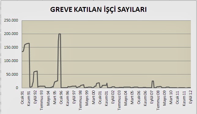 1992 yılında grevdeki işçi sayısı 165 bini, 1995 yılında 200 bini bulan grevdeki işçi sayıları son 15 yıldır birkaç istisna haricinde binli hatta yüzlü sayılara düşmüş durumda. 2007 yılındaki Telekom grevi bu konuda önemli istisnalardan biri. 2007 yılının son aylarında 26 bin işçi greve çıkmıştı. 2013 yılı bu anlamda grevler açısından önemli bir yıl oluyor.