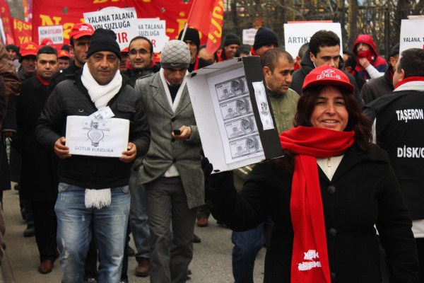 Yürüyüşte emekçiler boş kutular taşıyarak yolsuzluğu protesto etti, "Bu pisliği emekçi halk temizler" dedi.