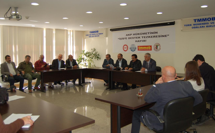 KESK, DİSK, TMMOB ve TTB, AKP Hükümeti’nin 2 Ekim tarihinde TBMM Genel Kurulu’na getireceği askeri operasyonlara ilişkin tezkere konusunda “emekçiler ölümden yana değil; yaşamdan yana taraftır” diyerek bugün (30 Eylül) TMMOB’de bir basın toplantısı düzenledi.