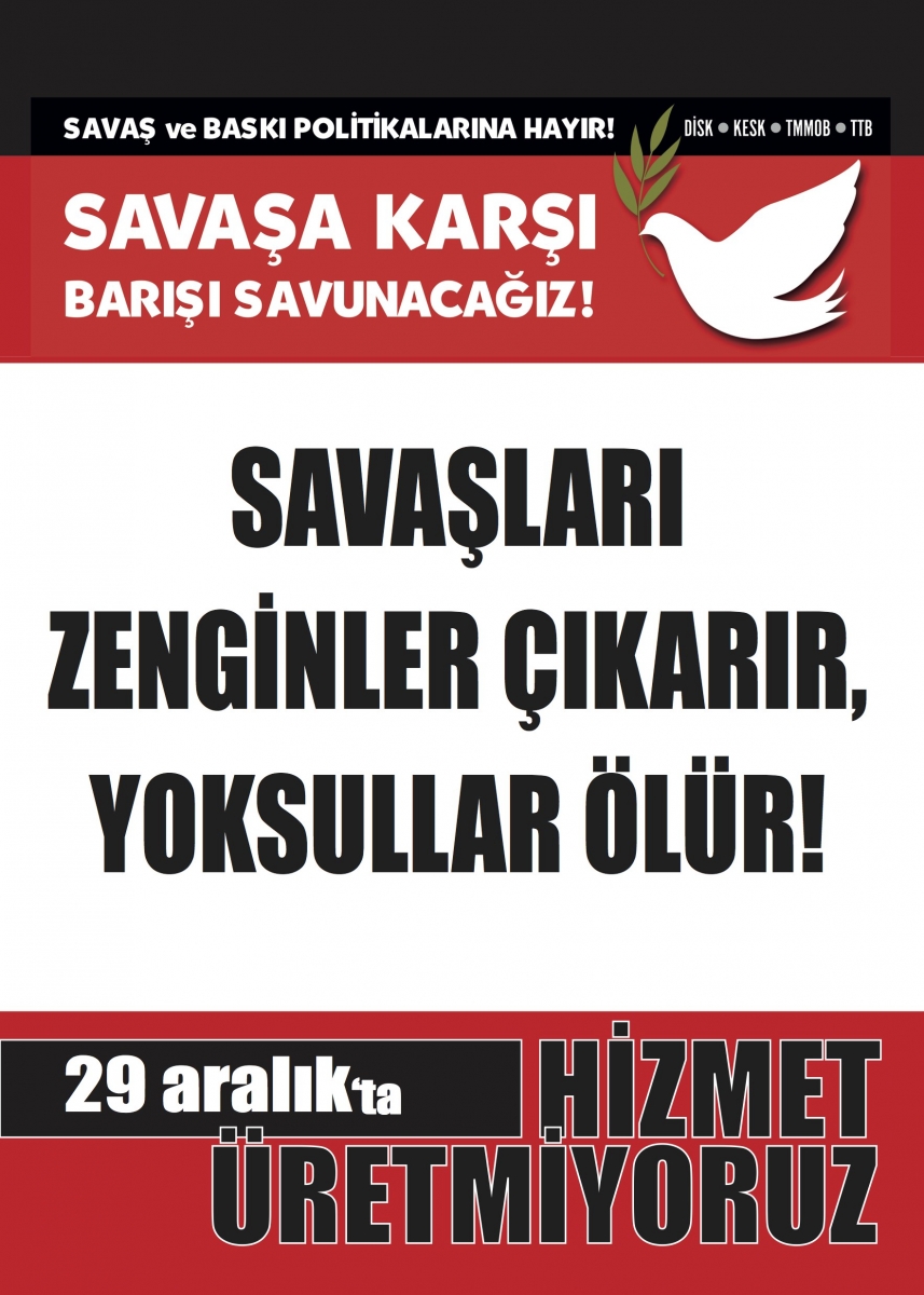 SAVAŞA KARŞI BARIŞ İÇİN 29 Aralık 2015 Salı günü KESK-DİSK-TMMOB-TTB olarak üretimden gelen gücümüzü kullanarak hizmet üretmiyoruz! Görsel materyallerimiz aşağıdadır Sticker’lar (Bildiri) PANKART İÇİN TIKLAYINIZ AFİŞ