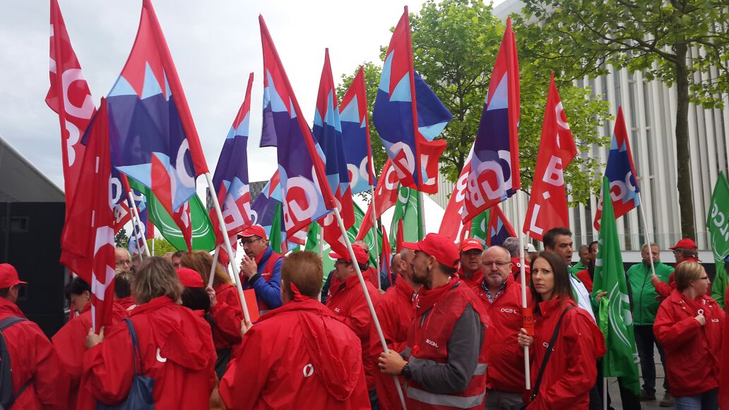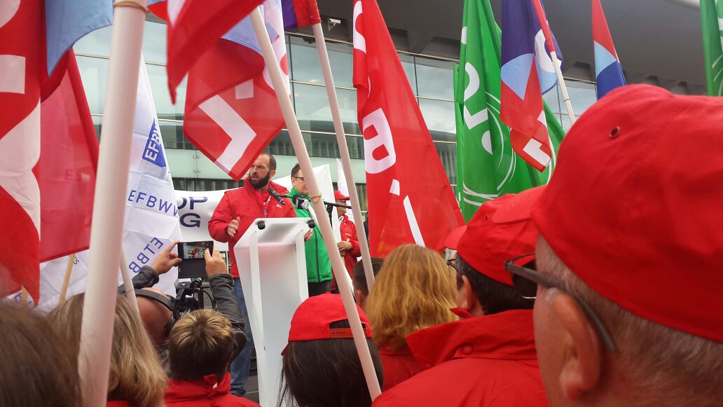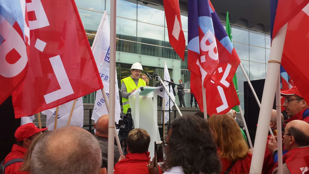 16 Haziran 2016 Perşembe günü saat 09.00’da Lüksemburg Europe Convention Centre (Avrupa Kongre Merkezi) önünde ETUC üyesi EFBWW (European Faderation of Building and wood Workers – Avrupa İnşaat ve Ağaç İşleri Federasyonu) “Sosyal adalet, eşit işe eşit ücret, çalışma koşullarının düzeltilmesi ve güvenceli çalışma” talepleriyle bir eylem gerçekleştirdi.