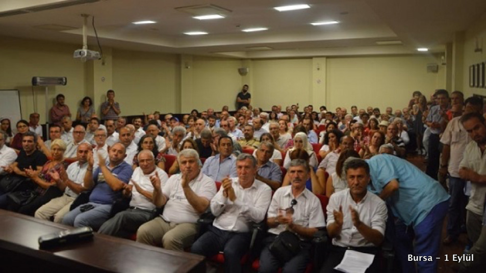 Bursa Emek ve Demokrasi için Güç Birliği engellemelere rağmen Baro Lokali’nde toplanarak basın açıklaması yaptı. Açıklamada “Valilik il genelinde yapılacak her türlü etkinliği yasakladığını duyurmuştu. Ama biz demokrasi ve barış’ı savunanlar bu yasakları dinlemeyerek barış’a sahip çıkmak için burada toplandık. Bir ay boyunca iktidar yanlısı gösterilere tüm alanları tahsis edenlerin, ulaşımı dahi ücretsiz hale getirenlerin, sokakta barış talebinin dile getirilmesini yasaklaması, AKP’nin baskıcı, otoriter ve anti demokratik zihniyetini ortaya koyuyor. Bu ülkeye barış gelene kadar, bu ülkede demokrasi tüm kurum ve kurallarıyla işler haline gelene kadar her türlü baskı ve zora direnerek alanlarda olmaya devam edeceğiz” ifadelerini kullanıldı.