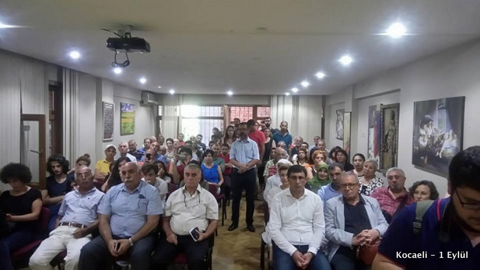 Kocaeli’nde 1 Eylül’ün yasaklanması ve Eğitim-Sen şubemizin bulunduğu binanın polis tarafından ablukaya alınması üzerine, 1 Eylül Dünya Barış Günü basın açıklaması bina içinde yapıldı. Ardından binadan toplu olarak çıkılarak polislerin keyfi uygulaması protesto edildi.