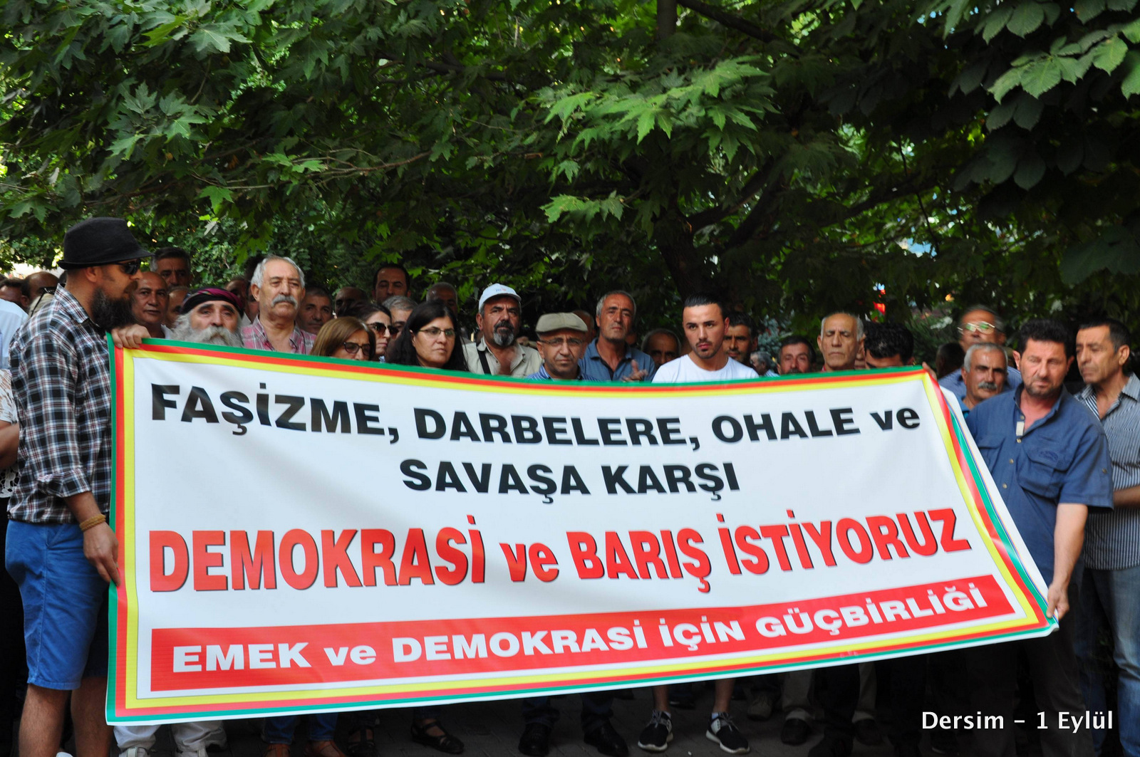 Dersim Emek ve Demokrasi için Güç Birliği bileşenleri, “Faşizme, darbelere, OHAL’e ve savaşa karşı demokrasi ve barış istiyoruz” yazılı pankart açarak Sanat Sokağı’ndan Seyid Rıza Meydanı’na yürüdü. Saygı duruşunun ardından Emek ve Demokrasi için Güçbirliği’nin ortak metni okundu.