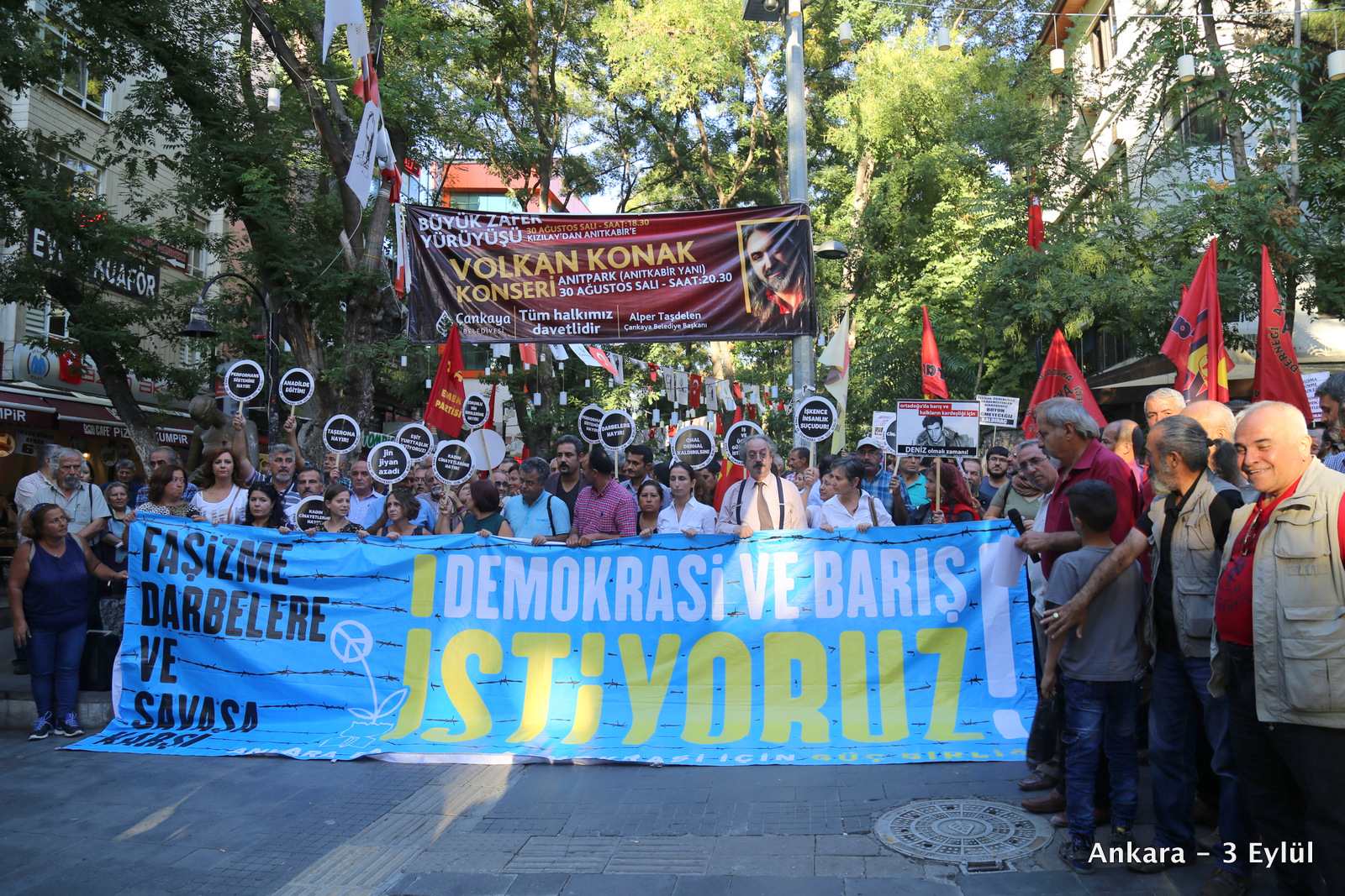 Ankara’da Emek ve Demokrasi İçin Güç Birliği’nin çağrısıyla 3 Eylül Cumartesi günü gerçekleştirilecek 1 Eylül Dünya Barış Günü Mitingi’nin Valilik tarafından mitinge yarım saat kala IŞİD gerekçe gösterilerek “güvenlik” nedeniyle yasaklanması Yüksel Caddesinde protesto edildi. Burada buluşan Emek ve Demokrasi için Güçbirliği basın açıklaması gerçekleştirdi.
