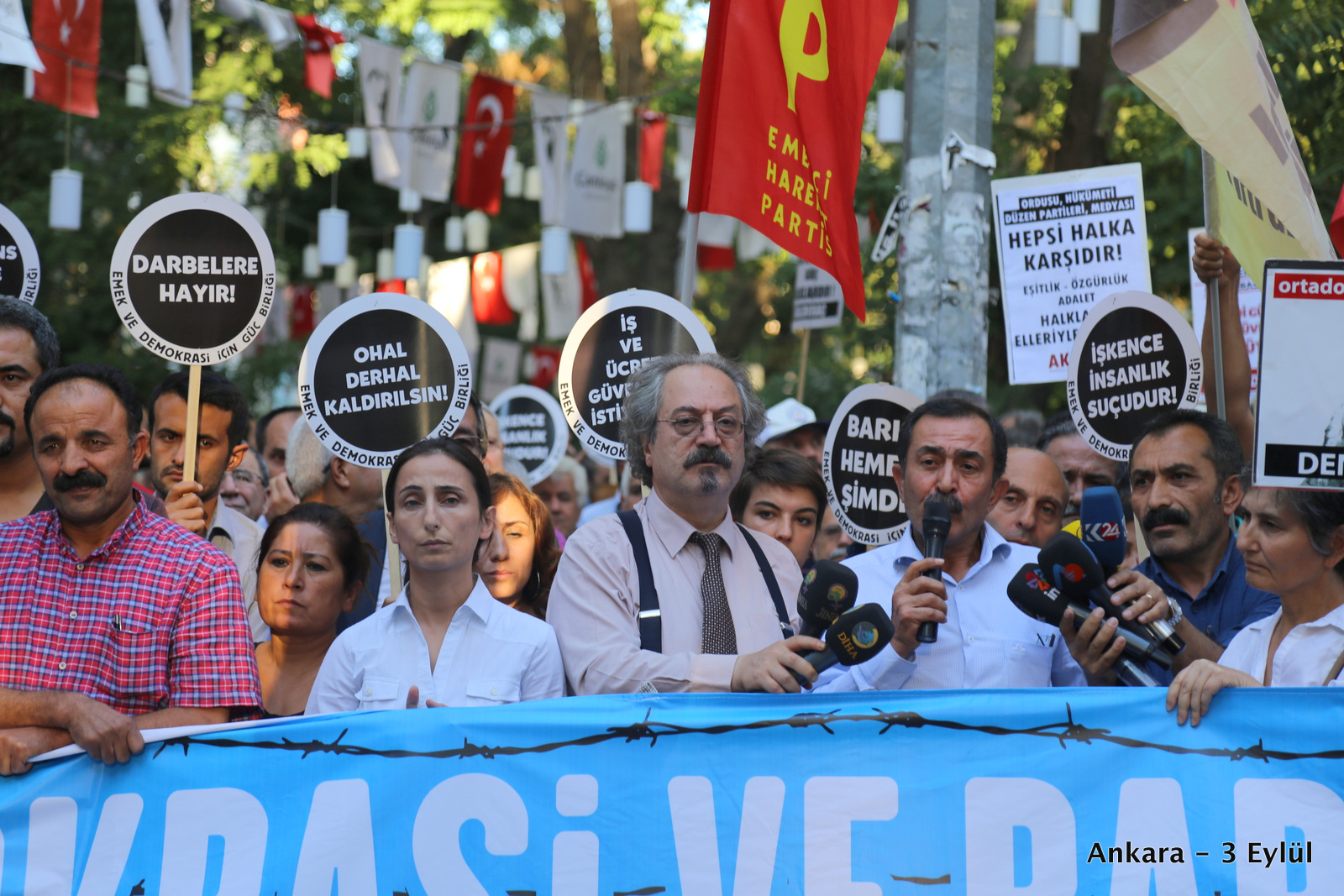 Emek ve Demokrasi İçin Güç Birliği adına basın açıklamasını yapan DİSK İç Anadolu Bölge Temsilcisi Tayfun Görgün, “Dünya Barış Günü kutlamaları daha önce birçok ilde yasaklanmıştır. Bu antidemokratik uygulamaları buradan kınıyor, OHAL’in kaldırılmasını, darbe girişimi ile hiçbir şekilde ilişkisi olmayan kamu emekçilerinin, akademisyenlerin ve eğitim emekçilerinin, gazetecilerin mağduriyetlerinin giderilmesini buradan haykırıyoruz. Aksi halde bu çılgınlıkta ısrar etmek ülkemizi bir felakete sürükleyecektir.” dedi