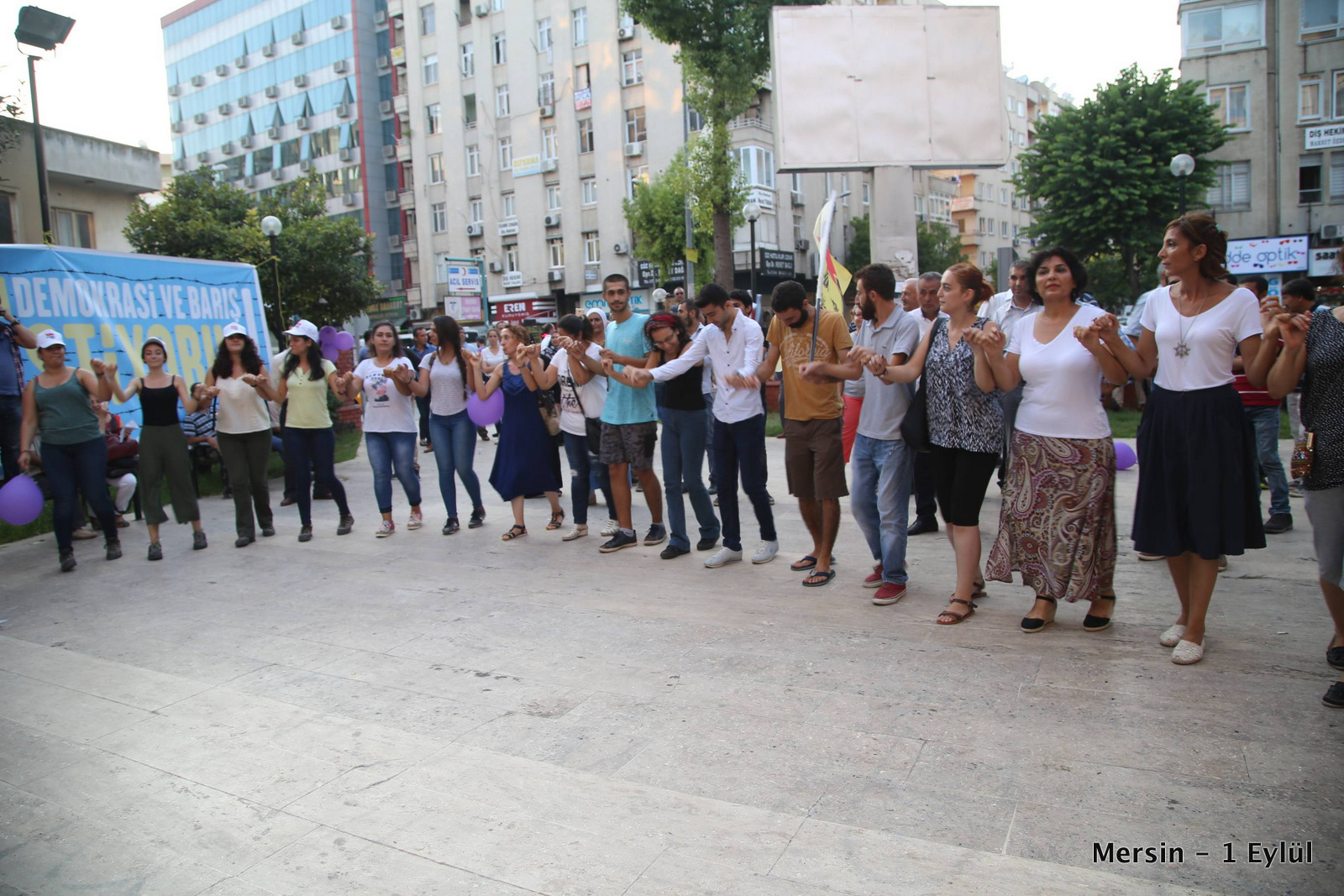 Mersin’de Özgür Çocuk Parkı’nda buluşan coşkulu kitle 1 Eylül Dünya Barış Günü etkinliğine Vedat Türkali anmasıyla başladı. Burada yapılan ortak açıklamada “1 Eylül’ün Dünya Barış Günü olarak ilan edilmesi üzerinden tam 77 yıl geçmesine rağmen hala ülkemizde ‘kutlu olsun’ diyemiyoruz” denilerek savaş ve baskı politikaları protesto edildi. Ayrıca Mersin Kadın İnisiyatifi adına konuşan Havva Avcı da Aslı Erdoğan ve Necmiye Alpay’ın toplumun vicdanı olan kadın ve yazarlarından olduğunu ifade ederek “Onlarının tutuklanması bu toplumun vicdanının tutuklanmasıdır” dedi.