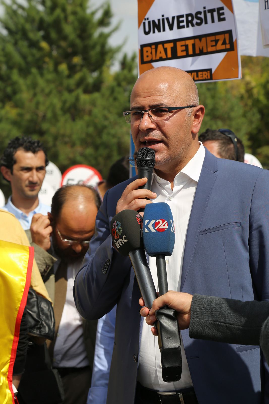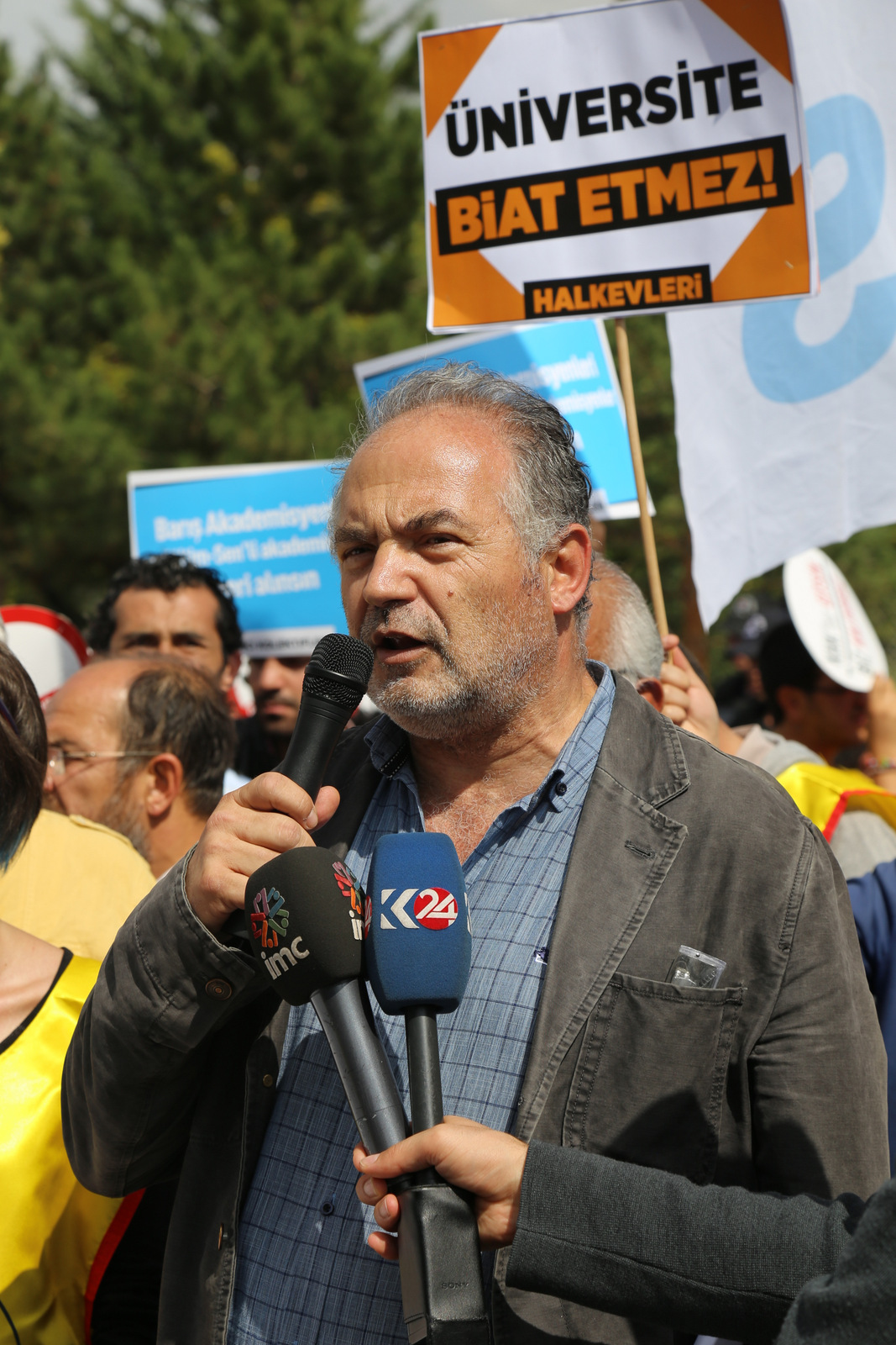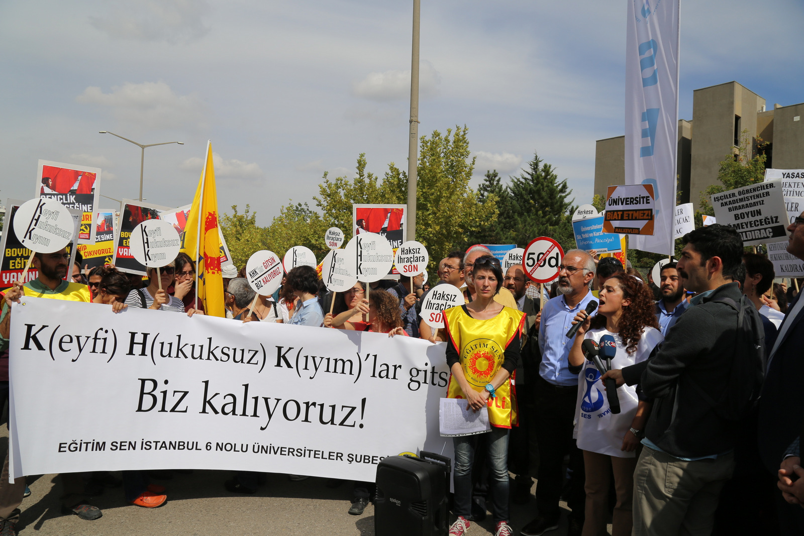 Bizler burada, ülkenin farklı üniversitelerinde emek-barış ve demokrasi mücadelesi yürüttüğü için işinden atılmış akademisyen arkadaşlarımıza sahip çıkmak, ÖYP düzenlemesiyle hayatları alt üst edilen arkadaşlarımızın sesini duyurmak ve herkes için iş güvencesi talep etmek üzere bir araya geldik. İşinden atılan, geleceği karartılan akademisyenler ve yükseköğretim emekçileri olarak taleplerimizi güçlü bir şekilde haykırmak için buradayız.