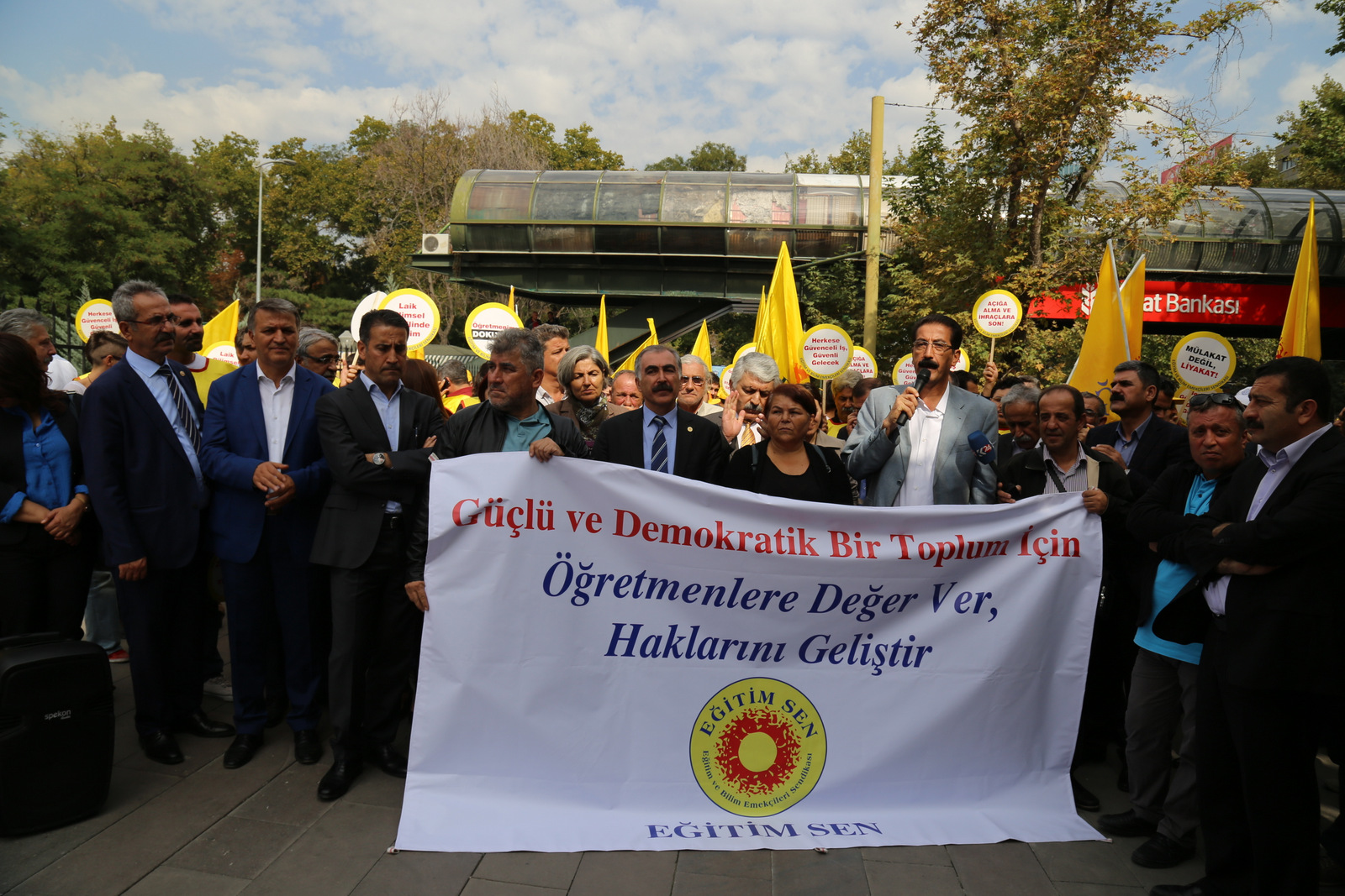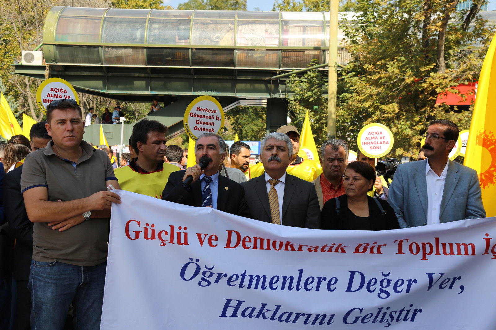 Asıl suç sendikal faaliyetlerimizin suç olarak nitelendirilmesidir. Bakanlıktan başlayıp il müdürlüklerinize, okul müdürlüklerinize kadar yandaş, ihbarcı, ispiyoncu konfederasyonunuz dahil hiçbiriniz hukukun, adaletin önünden kaçamayacaksınız, bunun hesabını elbette sizden sormaya devam edeceğiz. Varsın haksız, hukuksuz zulüm ve zorbalığa dayalı cezalandırma yöntemlerini öne çıkarsınlar. Biz kamu emekçilerinin nezdinde, bütün ezilenlerin, ötekilerin, öğrenci ve velilerimizin nezdinde bilimsel, demokratik, laik, anadilinde eğitimin temsilcileri ve sembolleriyiz. Biz 3 milyon kamu emekçisinin güvencesiyiz. Biz eğitimin aydınlık yüzüyüz. Bu nedenle ne olursa olsun biat etmeyecek, direneceğiz. Gözlerini iş güvencemize dikenlere sesleniyorum, biz 12 Eylül’ün darbe koşullarında başlayan mücadelemizi sürdüreceğiz. Çocuklarımıza sözümüz var. Onurlu bir gelecek bırakmak için, insanca bir yaşam için sözümüz var.” diyerek ‘Kurtuluş Yok Tek Başına Ya Hep Beraber Ya Hiçbirimiz’ sözleriyle konuşmasını bitirdi.