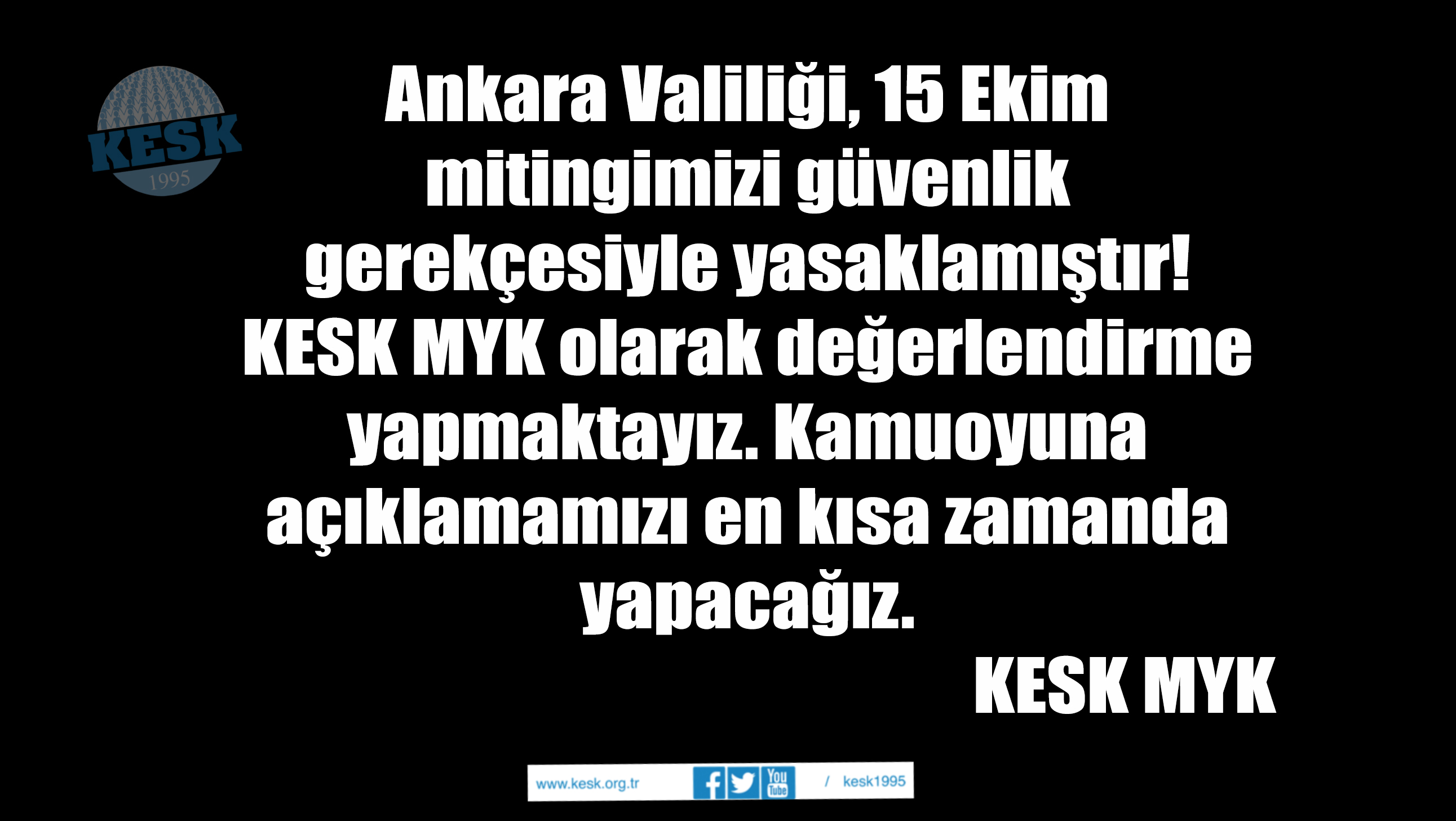 Ankara Valiliği, 15 Ekim mitingimizi güvenlik gerekçesiyle yasaklamıştır! KESK MYK olarak değerlendirme yapmaktayız. Kamuoyuna açıklamamızı en kısa zamanda yapacağız.KESK MYK