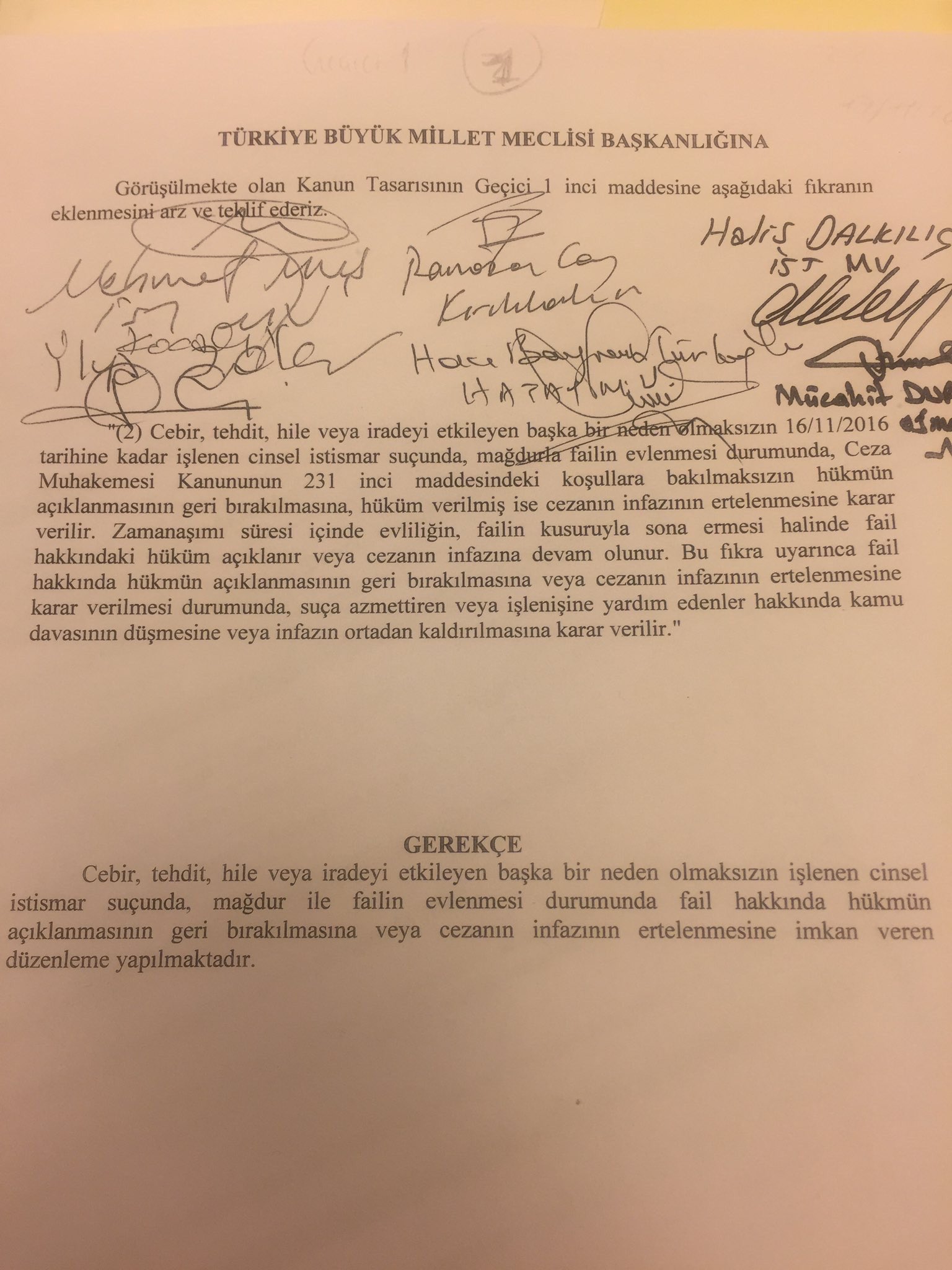 AKP, cinsel istismar suçunda mağdurla failin evlenmesi durumunda hükmün açıklanmasının geri bırakılmasına ilişkin dün gece yarısı Meclis’e bir önerge sundu. Bu önerge ile 4 bin tecavüzcüye tahliye yolu açılacak. Meclis’te AKP’li vekiller çocuğun istismarcısıyla evlenmesi durumunda istismarcının ceza almaması için yasa…
