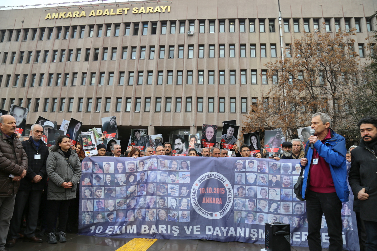 10 Ekim Ankara Katliamı’nın ikinci duruşması Ankara 4. Ağır Ceza Mahkemesi’nde görülmeye başladı. Duruşma öncesi adliye önünde açıklama yapan aileler ve avukatları duruşma salonuna girdi.