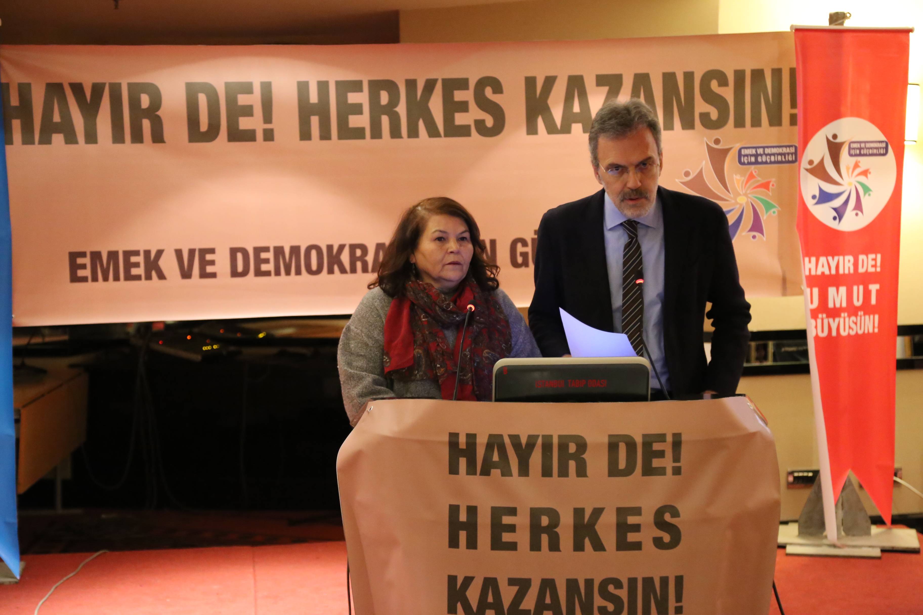 Şimdi işçiler, emekçiler, kadınlar, gençler, bütün ötekiler olarak önümüzde bir fırsat var. Referandum son yüz yıllık tarihimizde yapılan sayısı anayasal değişikliğin çok ötesinde, ülkemizi ve geleceğimizi çağdışına itecek bir rejim değişikliğinin onaylanıp onaylanmaması olarak geçecek. Toplum olarak bu fırsatı iyi değerlendirmeliyiz. Bunun için geleceğimiz hakkında kararı biz veririz, ‘Hayır’ diyoruz. Herkesi ‘Hayır’da birleşmeye çağırıyoruz. ‘Hayır’ de herkes kazansın.”