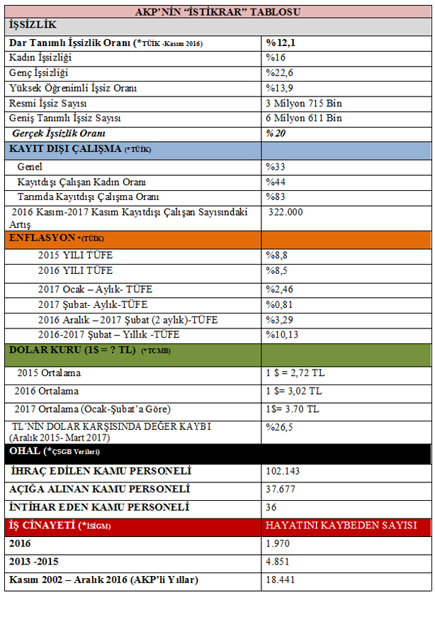 AKP hükümeti 16 Nisan’da yapılacak “Bütün Güç, Yetki Tek Adama” referandumu için tüm kaynaklarını seferber etmesine rağmen bütün ekonomik-sosyal göstergeler ciddi anlamda bozulmuştur. Bu temel göstergelerin emek cephesine genel yansımalarına baktığımızda karşımıza aşağıdaki ‘İstikrar Tablosu’ çıkmaktadır.