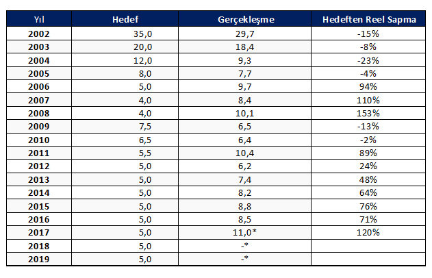 2002 yılından bu yana AKP hükümetleri ve TCMB’nin hedeflediği enflasyon değerleri negatif yıllar dahil edildiğinde bile ortalama % 49 sapma göstermiştir. 2006’dan sonra bu ortalama sapma artarak % 69 olmuştur.