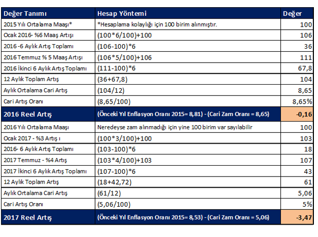 2015 TÜİK yıllık enflasyon verilerine göre 2016 ve 2017 yılında kamu emekçilerinin maaş artışı negatiftir. Sadece enflasyon temel alınarak verilen artış reel değildir. 2016 yılı için zam “SIFIRIN ALTINDA Yüzde -0,16 iken 2017’de bu oran daha da düşerek – 3,47 olarak gerçekleşmiştir.