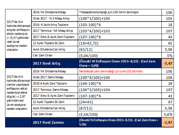 Buna rağmen malum konfederasyon ve bağlı sendikalar yukarıdaki tabloda açıkça %8,65 olan oranının %11 hatta kümülâtif olarak %11,4 olduğunu kamuoyuna deklere edebilmişlerdir. Yine % 5,06 olan oran için % 7 iddiasında bulunabilmişlerdir. Oysa aşağıdaki tablodan görüleceği üzere 2017 yılı için öngörülen zammın %3 + % 4 yerine % 4+ %3 olması bile kamu emekçilerinin daha lehinde olan bir durum olacaktır.