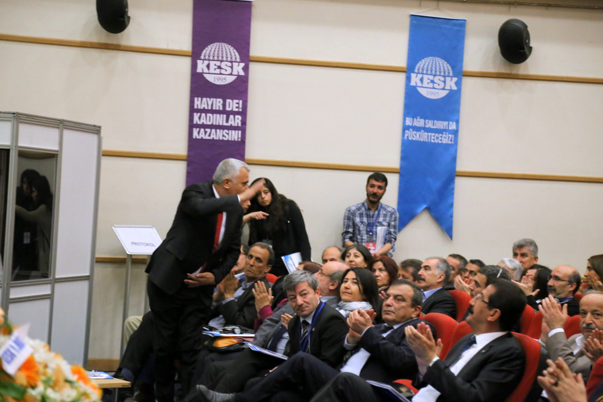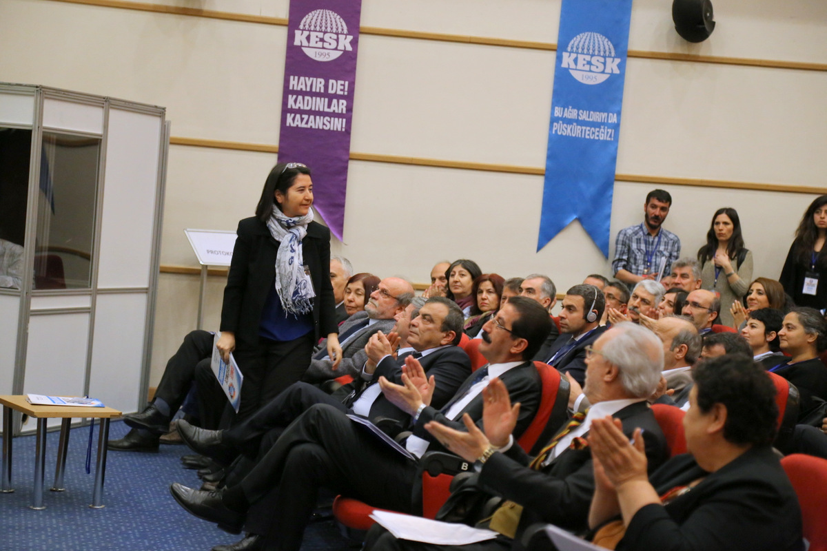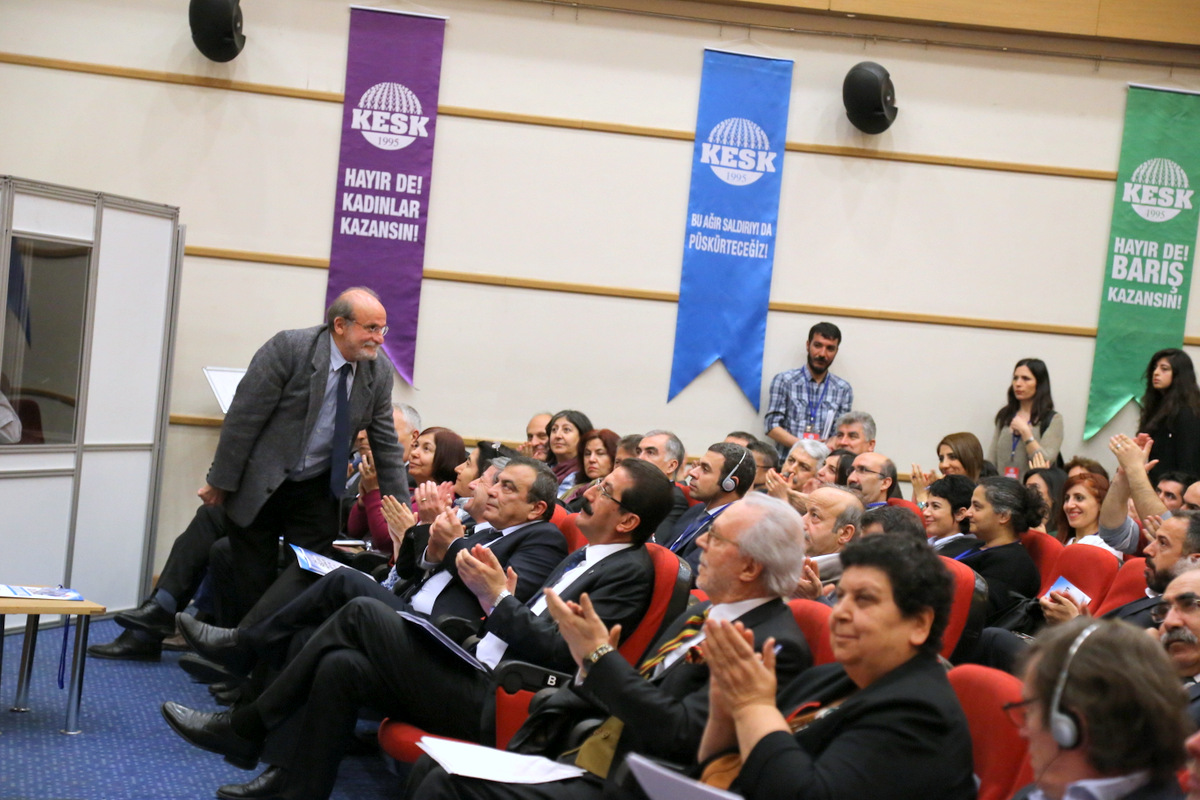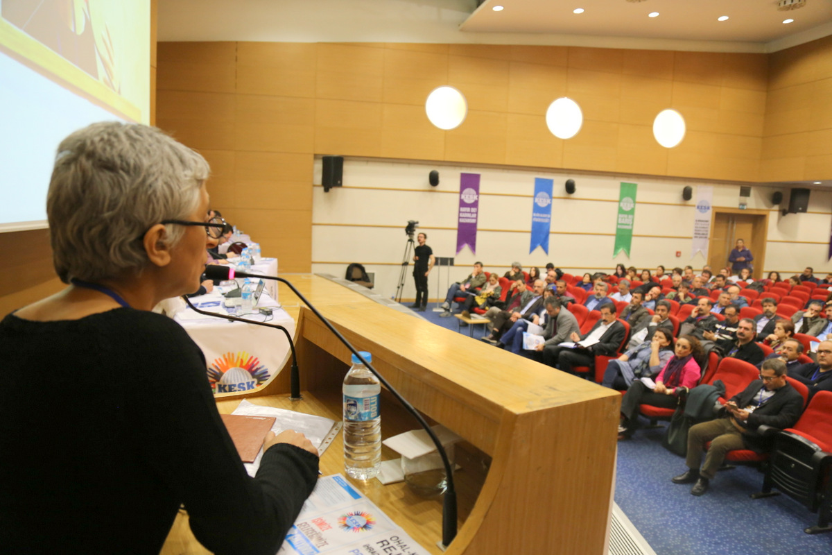 Konfederasyonumuzun bir üyesine yapılan haksızlığı tüm üyelerimize yapılmış bir haksızlık olarak gördüğümüze dikkat çeken Eş Genel Başkanımız, “İhraç edilen, açığa alınan arkadaşlarımız, iş güvencesine sahip çıktıkları, sendikal haklarını kullandıkları, örgütlenme özgürlüklerini hayata geçirmek istedikleri, Kürt sorununun demokratik barışçıl yollardan çözümünü savundukları için hedef haline getirildiler. Bilinmelidir ki, ihraç edilen arkadaşlarımız tekrar görevlerine dönünceye, OHAL kaldırılıncaya kadar, KHK’ler ve iş güvencesini ortadan kaldırmayı hedefleyen düzenlemeler geri çekilinceye kadar kesintisiz bir mücadele yürüteceğiz. Kurultayın Hayır’a güç katacağına olan inancımızı belirtmek istiyorum” dedi. Konuşmanın tam metni için tıklayınız