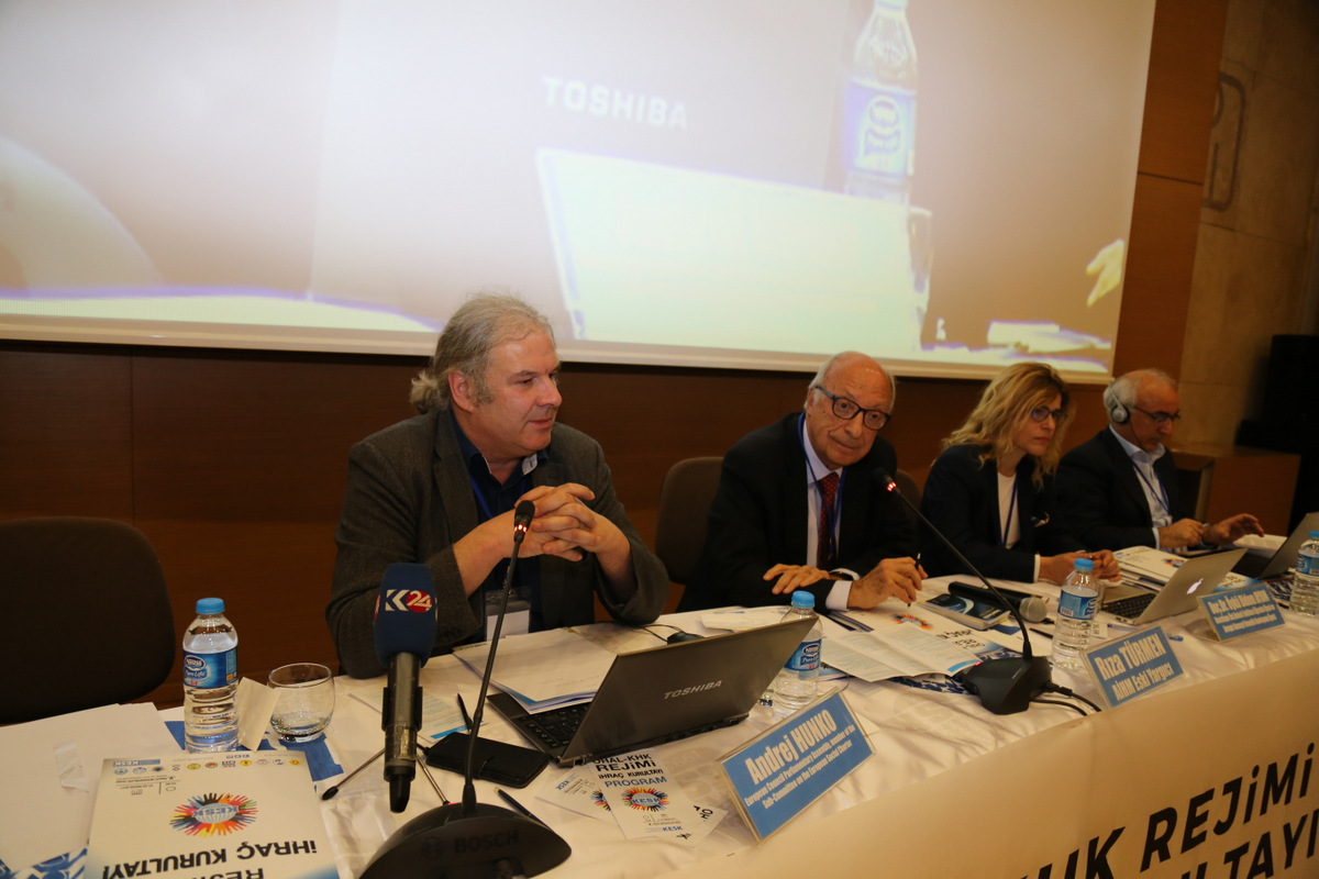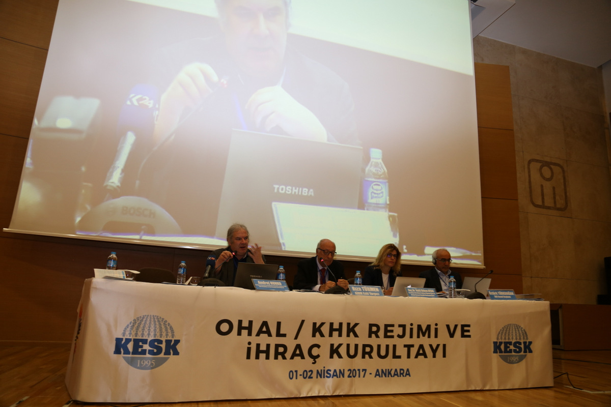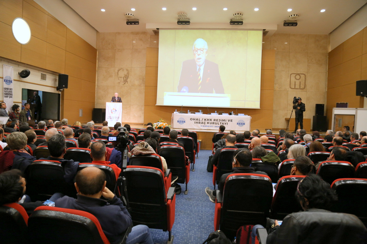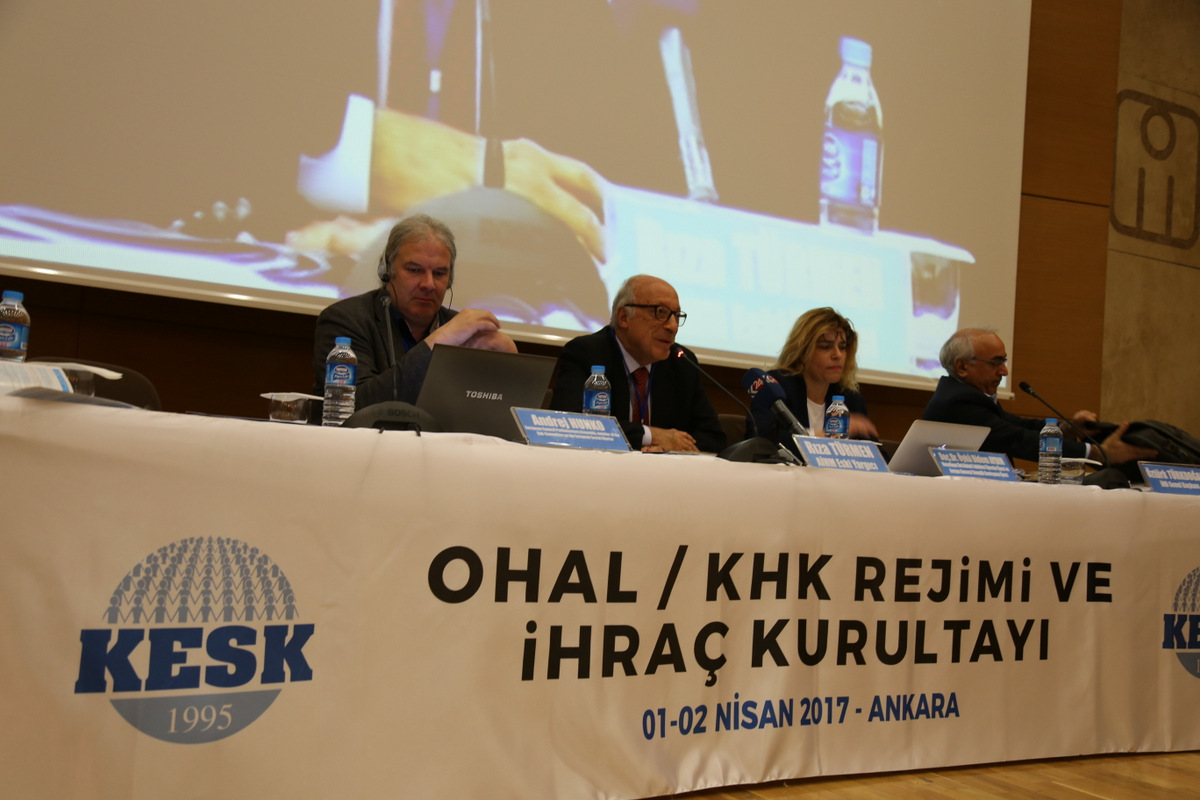 İlk oturum öncesi “OHAL ve Kanun Hükmünde Karnameler ve Hukuksal Durumu” Prof.Dr.Metin Günday değerlendirdi. Kurultayın, “İnsan Hakları Açısından İhraçlar” başlığıyla gerçekleştirilen ilk oturumunun moderatörlüğünü ise AİHM Eski Yargıcı Rıza Türmen yaptı. Avrupa Konseyi Parlamenter Meclisi, Avrupa Sosyal İşler ve Sosyal Şart Komite Üyesi Andrej Hunko, Hacettepe Üniversitesi Hukuk Fakültesi Öğretim Üyesi ve Avrupa Konseyi Venedik Komisyonu Üyesi Doç. Dr. Öykü Didem Aydın ile İnsan Hakları Derneği Genel Başkanı Öztürk Türkdoğan da ilk oturumda konuşmacı oldular.