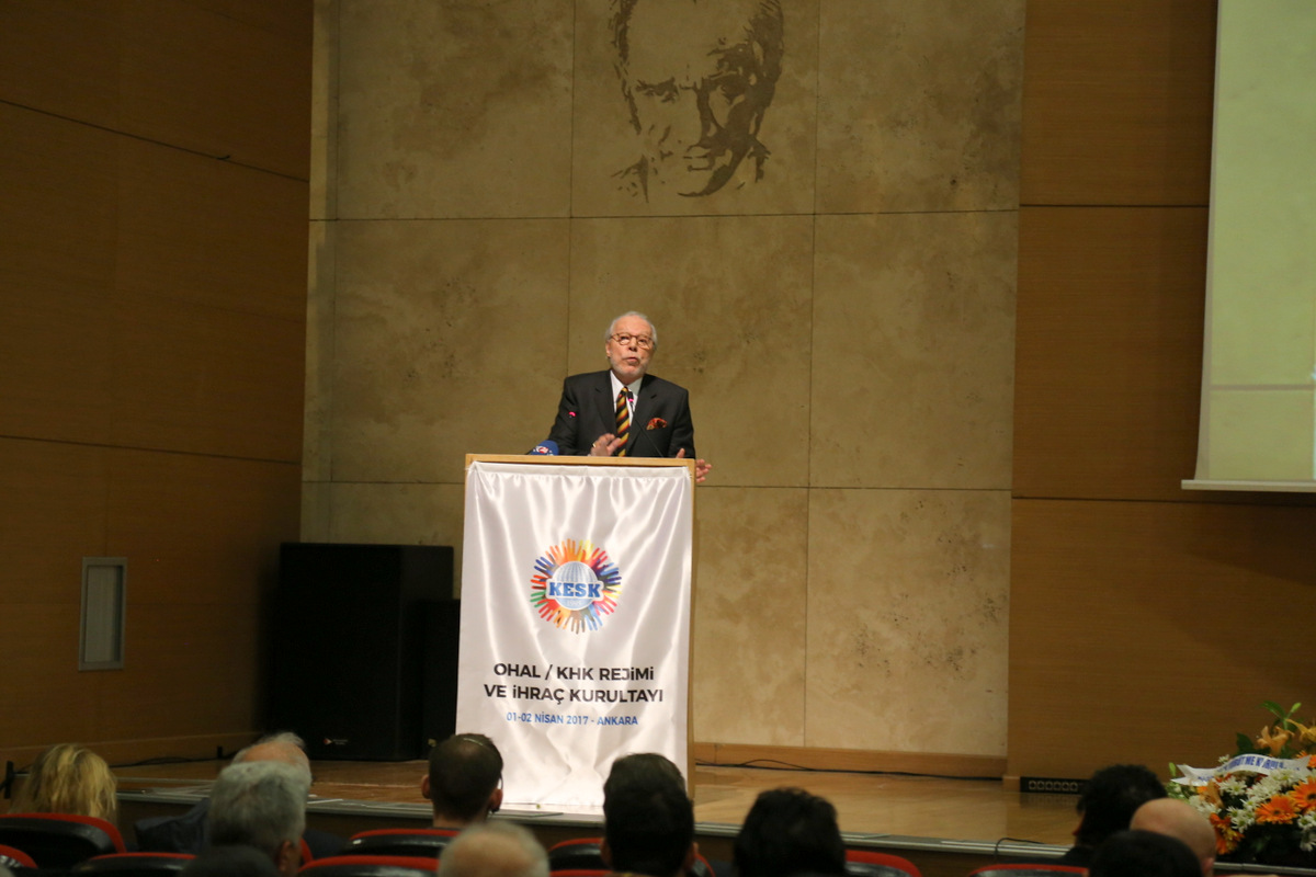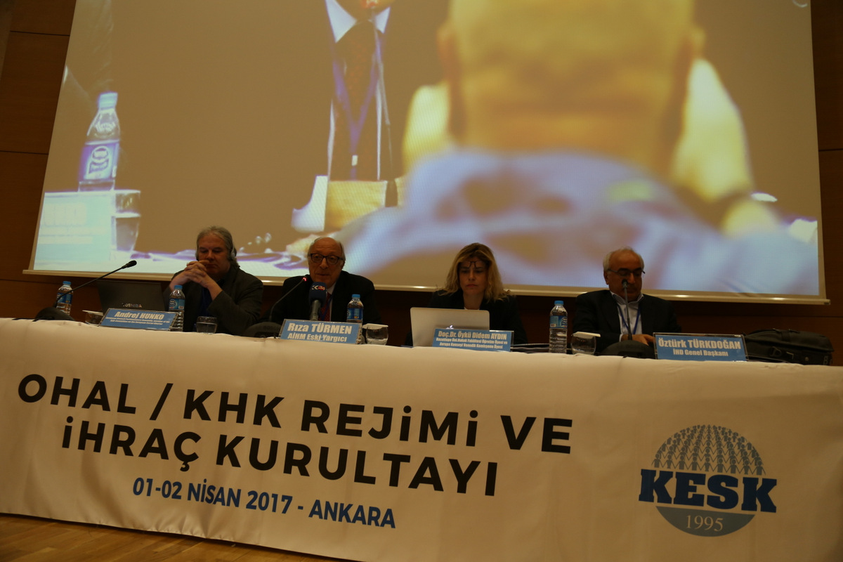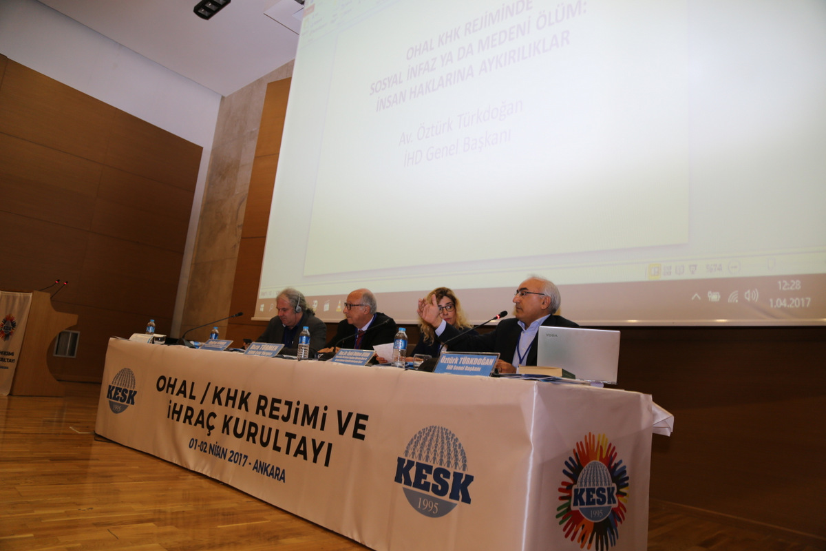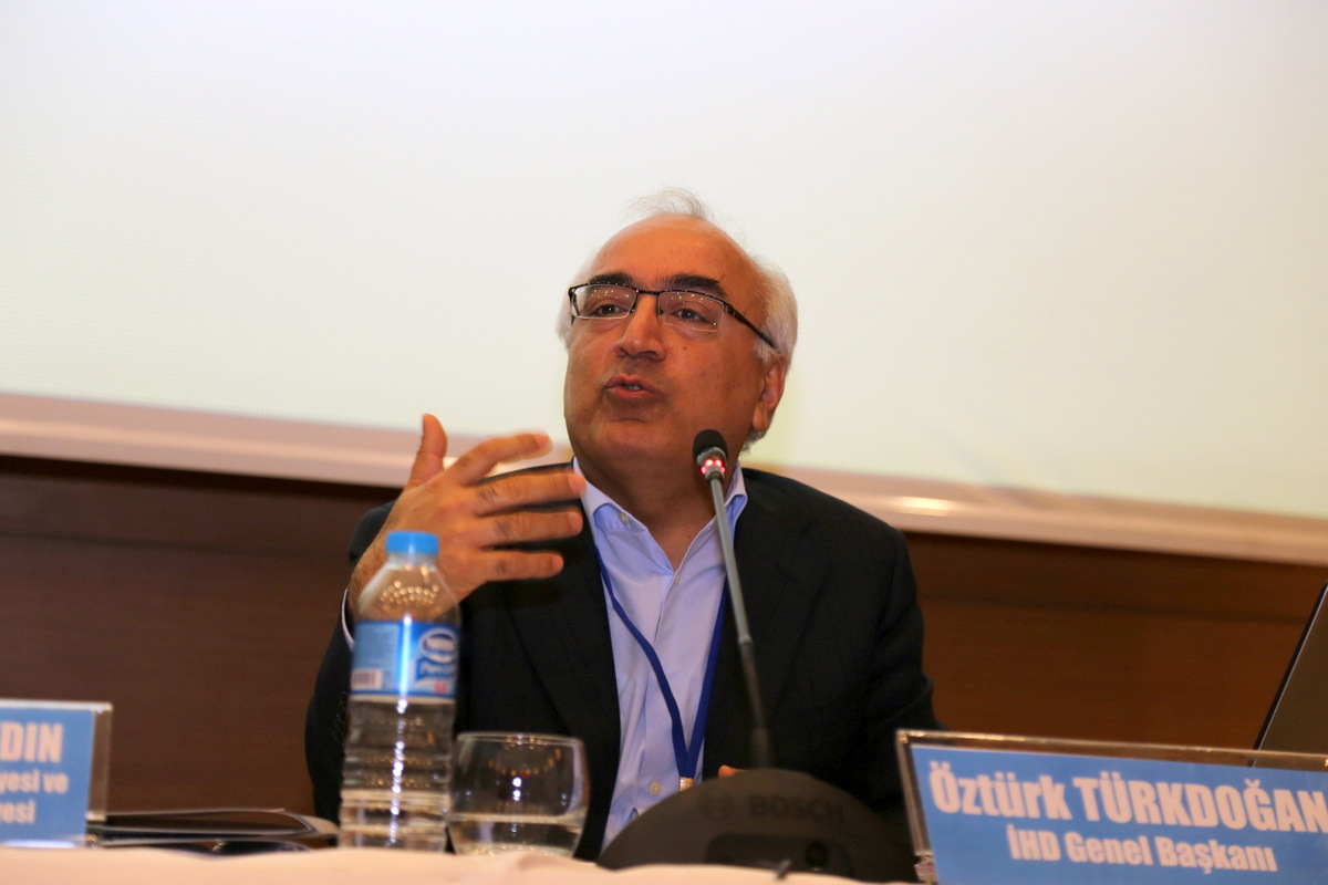 İnsan Hakları Derneği Genel Başkanı Öztürk Türkdoğan da yaşanan sürecin 15 Temmuz sürecinden önce başladığına dikkat çekti. Yaşan ağır hak ihlalleri, Ankara Gar ve benzeri katliamlar ile Davutoğlu hükümetinin düşürülmesinin büyük fotoğrafın parçası olduğunu belirtti. “Devlet kendine OHAL ilan ediyor” sözünün hukukta bir karşılığının olmadığını ifade eden Türkdoğan, şunları söyledi: “OHAL için hiçbir hukuki gerekçe yoktur. Bir hukuki gerekçe bulamıyoruz. 15 Temmuz’daki askerler derdest edilmedi mi? Darbe bastırılmadı mı? Neden o zaman OHAL ilan ettiniz? Devlet zaten kendi kurumları ile soruşturmalarını yapar.”dedi.