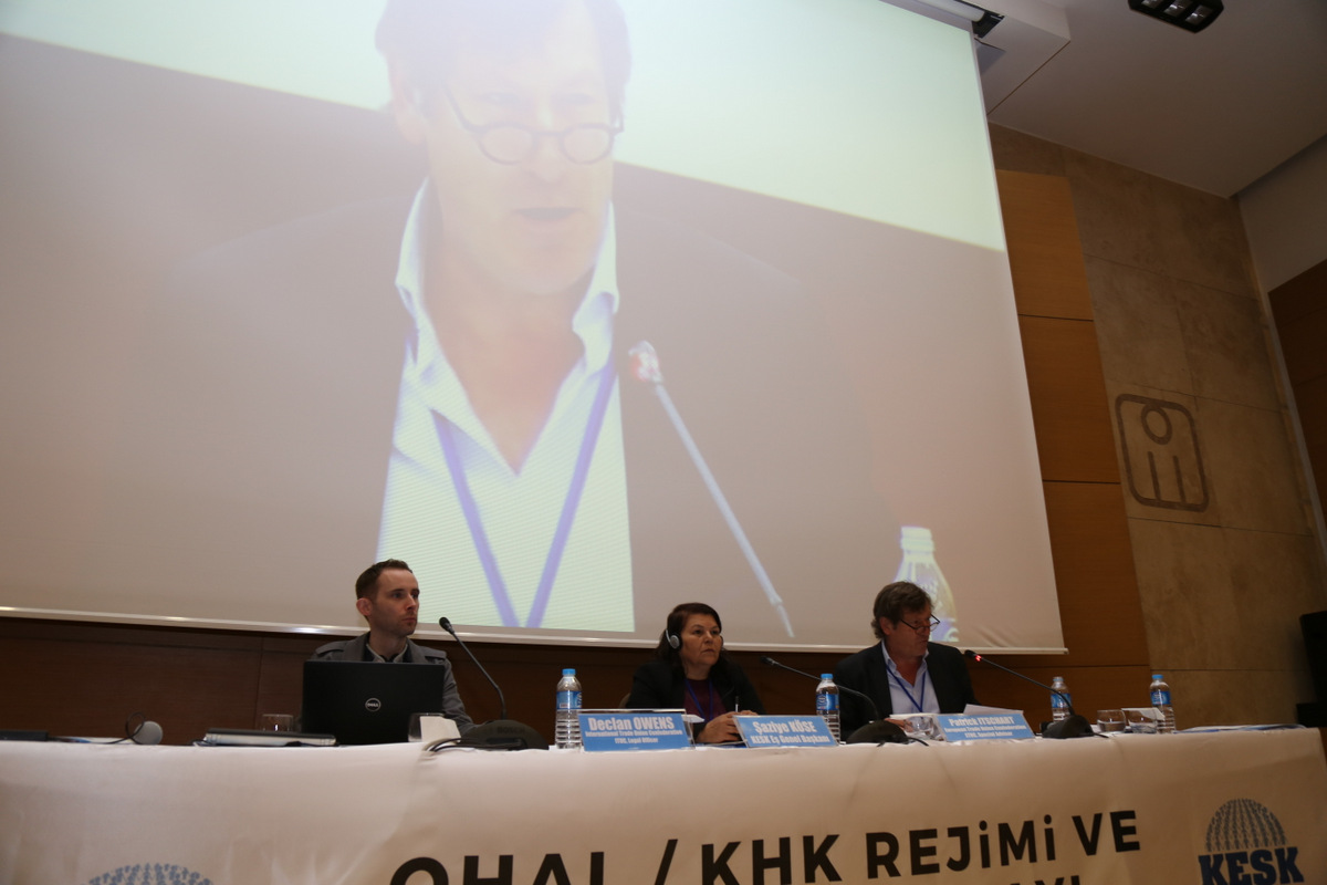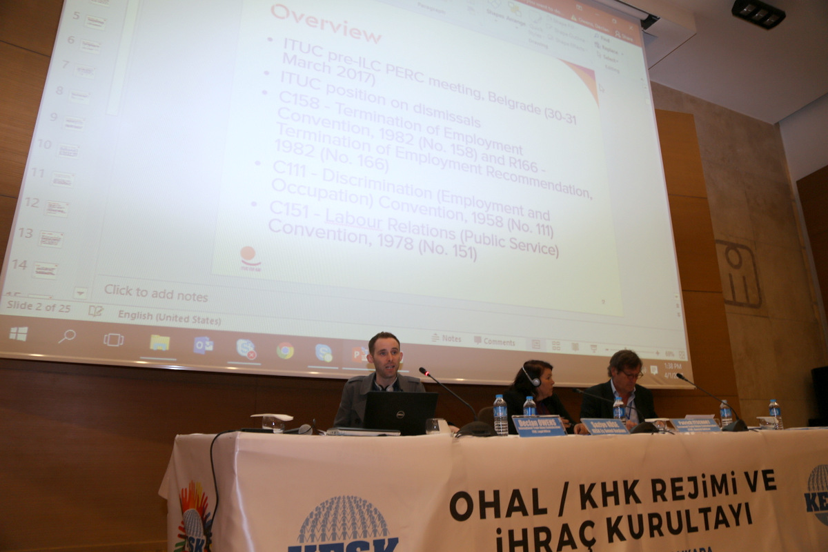 Uluslararası Sendikalar Konfederasyonu (ITUC) Hukuk Sorumlusu Declon Owens ise KESK’e yönelik kapsamlı ihraçlardan dolayı Türkiye’den bilgi istediğini ifade ederek, ihraçlarla ilgili kaygılarının hala devam ettiğini belirtti. Owens, şunları kaydetti: “İnsanlar herhangi bir soruşturma olmadan işlerinden atılıyor, Türk hükümetinden istese de istemese de uluslararası kuralları uygulamasını istiyoruz. İntikam hırsı ile yapılan uygulamalar ile insanlar işten atılamaz. Çalışanların toplantılara katılmaları, sendikal faaliyetlere katılmaları ihraç sebebi olamaz.