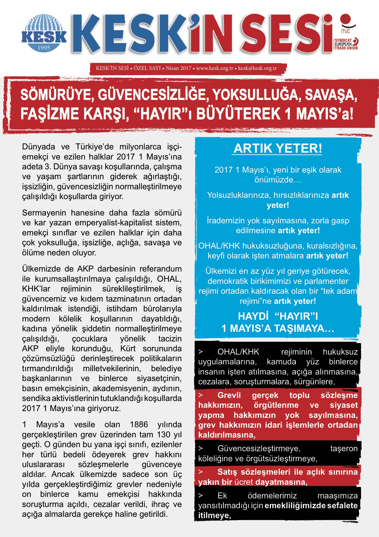 Sömürüye, Güvencesizliğe, Yoksulluğa, Savaşa, Faşizme Karşı, “HAYIR”ı Büyüterek 1 MAYIS’a!