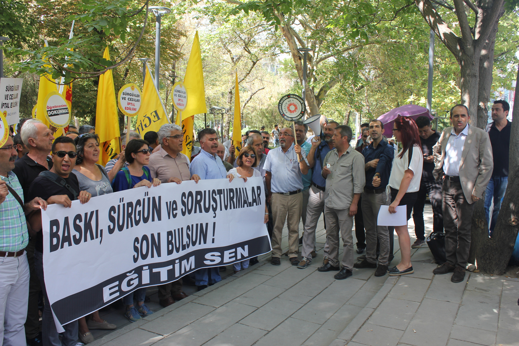 Eğitim Sen üye ve yöneticilerine yönelik olarak, sendikamızın mücadele tarihiyle yaşıt hale gelen baskı ve tehditler, ihraçlar ve sürgün kararlarıyla daha da şiddetlenmiştir. İktidarın politikalarına itiraz eden herkesin hedef haline getirildiği bu dönemde ülke çapında başlatılan ‘cadı avı’nın hedefinde uzun bir süredir Eğitim Sen üyeleri bulunmaktadır. AKP’nin ideolojik çizgisinde siyasallaşmış idari makamların disiplin soruşturmaları, verdikleri sürgün ve görevden alma kararları bu nedenle bizler için şaşırtıcı değildir.