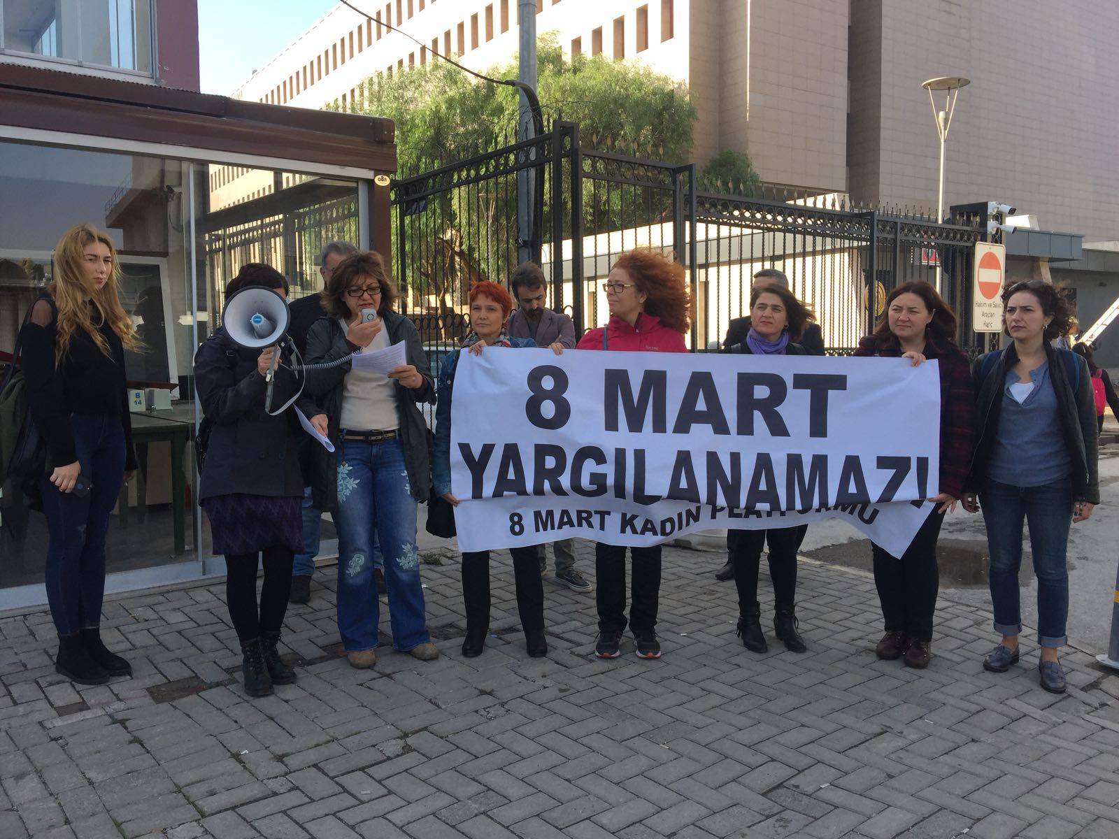 Duruşma öncesi, adliye önünde 8 Mart Kadın Platformu adına açıklama yapan İdil Uğurlu 8 Mart yargılanmaz diyerek üyelerimize atılı suçlamaların hiçbir gerekçesinin olmayacağını belirtti. Uğurlu, “Kadın düşmanı yasalarınızı tanımayacağız ve bu yasaları her yerde teşhir etmeye devam edeceğiz. Yaratılmaya çalışılan yeni ve geri bir toplumun inşa sürecine izin vermeyeceğiz. Sesimizi ve itirazlarımızı baskı ve şiddetle bastırma çabalarınıza rağmen her yerde kadın düşmanı yasalarınızı, teşhir etmeye devam edeceğiz” dedi.
