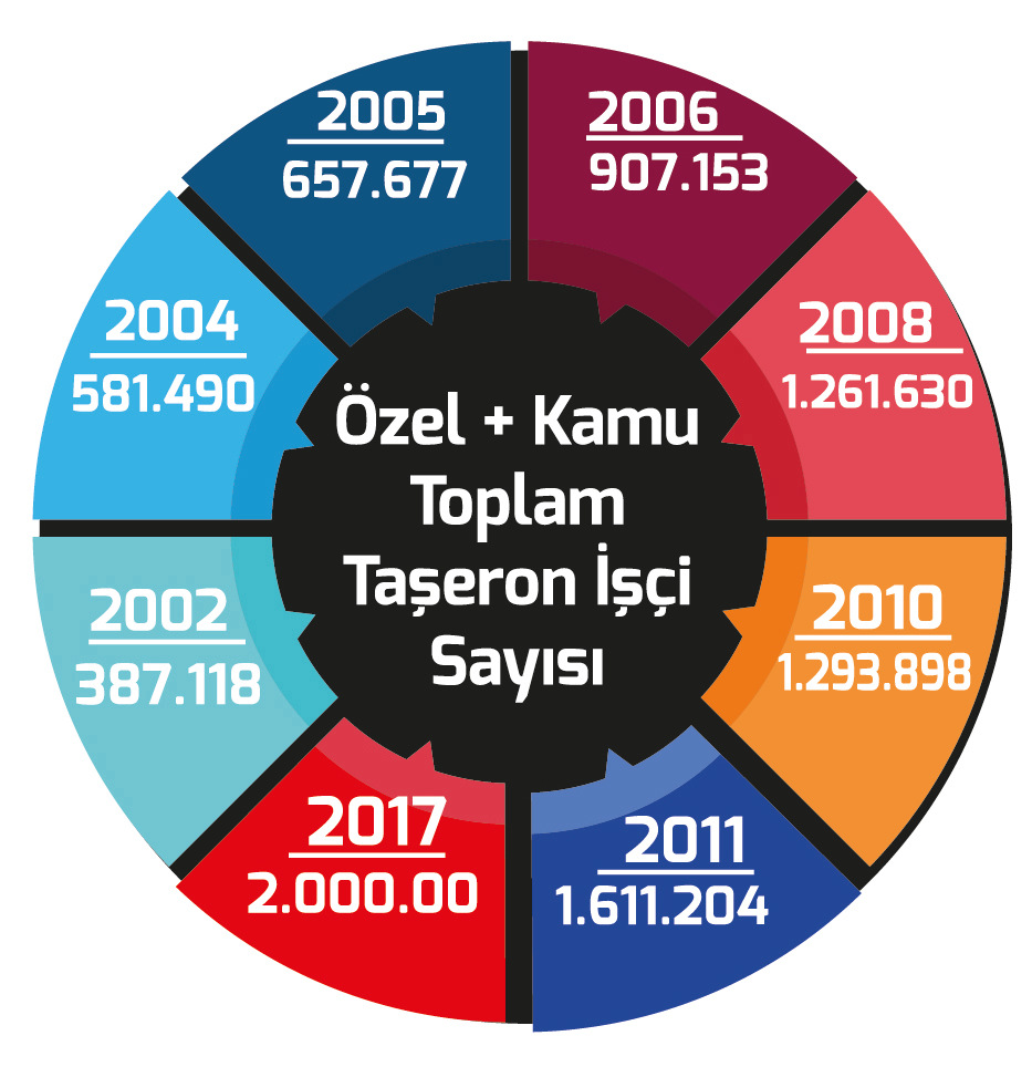AKP’nin iktidara geldiği 2002 yılında kamuda ve özelde çalışan toplam taşeron işçi sayısı 387.118 iken söz konusu sayı 2017 yılında 2 milyona çıkmıştır.