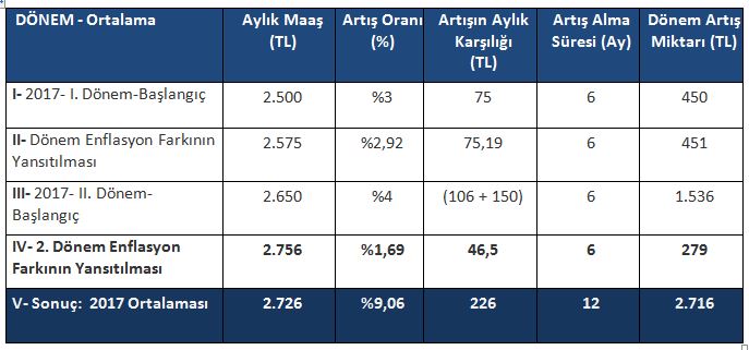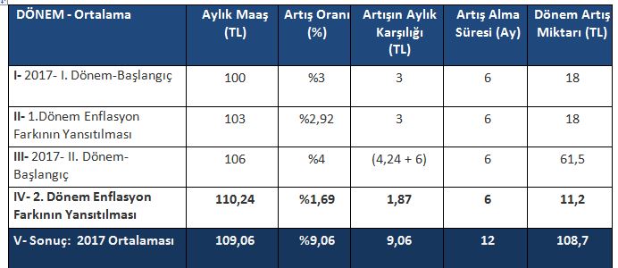- Tüm bunlardan sonra söz konusu kamu emekçisinin 2017 yılında cebine giren toplam ek tutar toplamı 108,7 TL olacaktır. Aylık ortalama maaş artışına söz konusu birikimli, kümülatif tutarın 12’ye bölünmesi ile ulaşılmaktadır. Bu durumda 2016 Aralık ayı itibari ile maaşı 100 TL olan kamu emekçisinin 2017 yılı 12 aylık ortalama maaşının (108,7/12) 9,06 TL arttığı yani %9,06 arttığı görülmektedir.