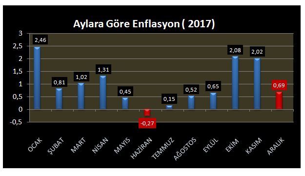 TÜİK yıllardır sürdürdüğü bu geleneğini! 2017 yılında da devam ettirmiştir. Yukarıdaki tablodan da görüleceği üzere birinci altı aylık dönem sonuna doğru enflasyon rakamları inişe geçmiştir. Mayıs ayında %0,45 olan enflasyon Haziran ayında eksiye geçerek % – 0,27 olmuştur. Ekim ve Kasım aylarında doruğa çıkan enflasyon maaş artışına denk gelen ikinci altı aylık dönemin son ayı olan Aralık ayında tekrar inişe geçmiş, %0,69 olarak açıklanmıştır.