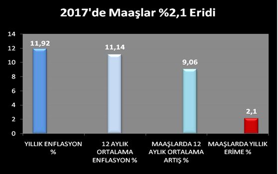 2017 YILLIK ENFLASYONU: %11,9412 AYLIK ORTALAMA ENFLASYON: %11,14KAMU EMEKÇİLERİNİN 12 AYLIK ORTALAMA MAAŞ ARTIŞI : %9,06ENFLASYON FARKI ÖDEMESİNE RAĞMEN GELİR VERGİSİ HARİÇ MAAŞLARDAKİ YILLIK ERİME : %2,1KAYIPLARIMIZ TELAFİ EDİLSİN! TÜİK tarafından bugün açıklanan enflasyon rakamları ile toplam beş milyon kamu emekçis…