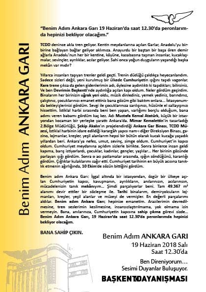 19 Haziran 2018 günü saat 12.30 da ise kurum arazilerinin peşkeş çekilmesini engellemek amacıyla Başkent Dayanışması bileşenleri Ankara Garı’nda buluştular.