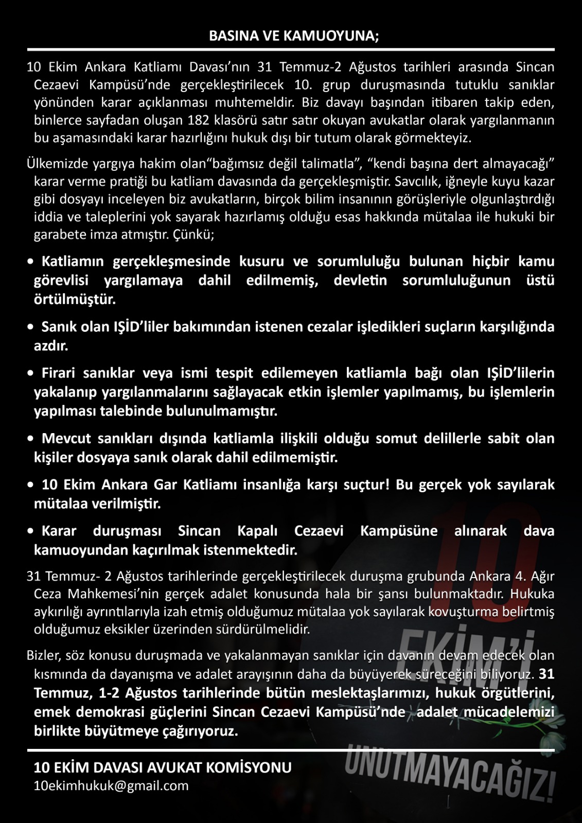 Bu davayı savcılığın oldukça eksik ve kabul edilemez mütalaasındaki bu haliyle kapatmaya çalışanlar bilsinler ki, ağıtlarımız, gözyaşımız, acılarımız ve öfkemizle yoğrulan adalet mücadelemiz hiç bitmeyecek! Katliamın tüm sorumluları yargılanana ve hak ettikleri cezayı alana kadar bu dava sürecek!