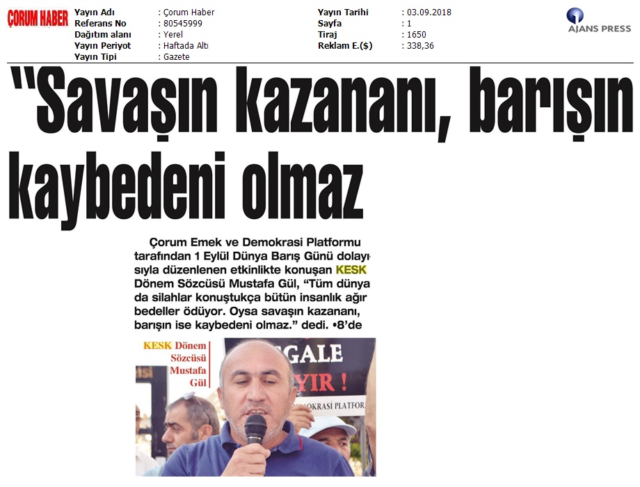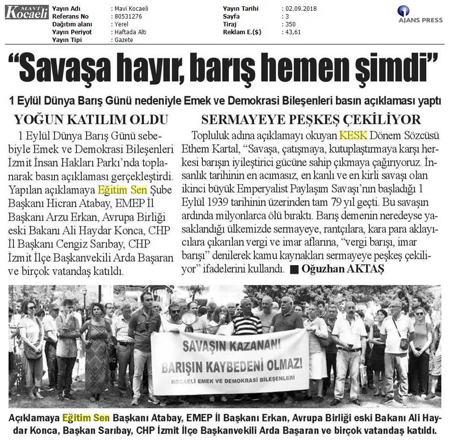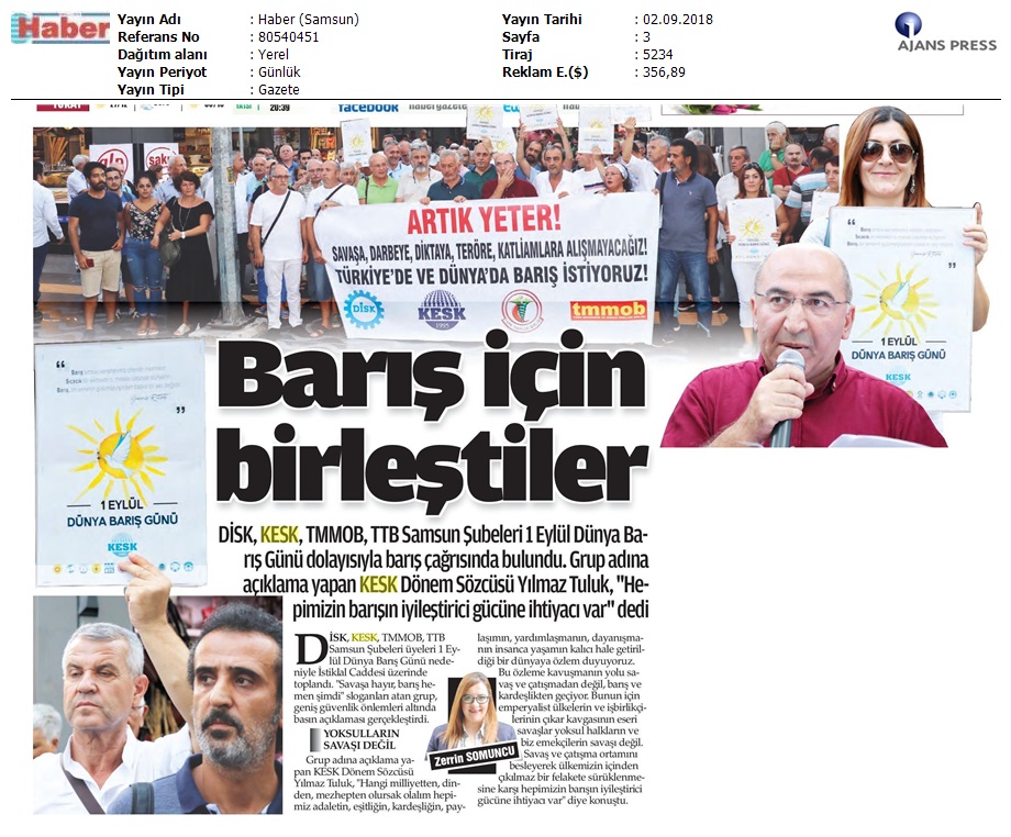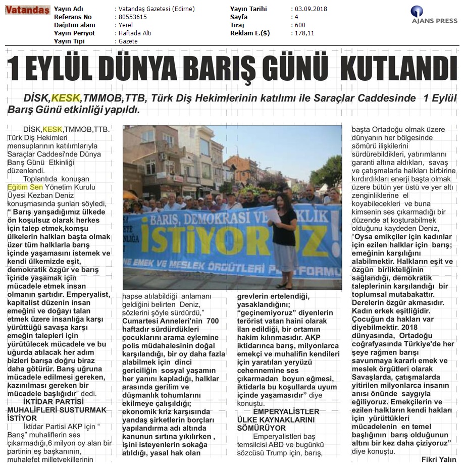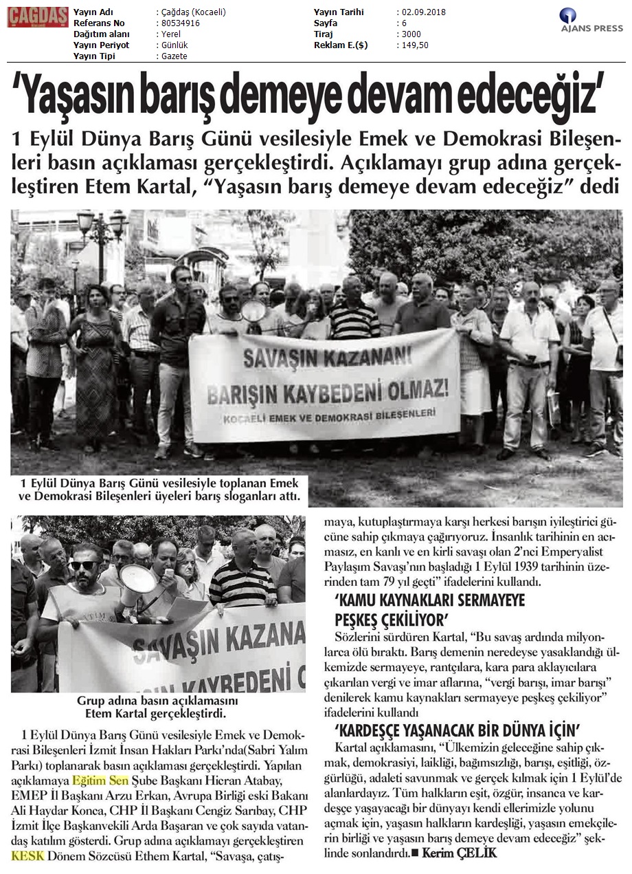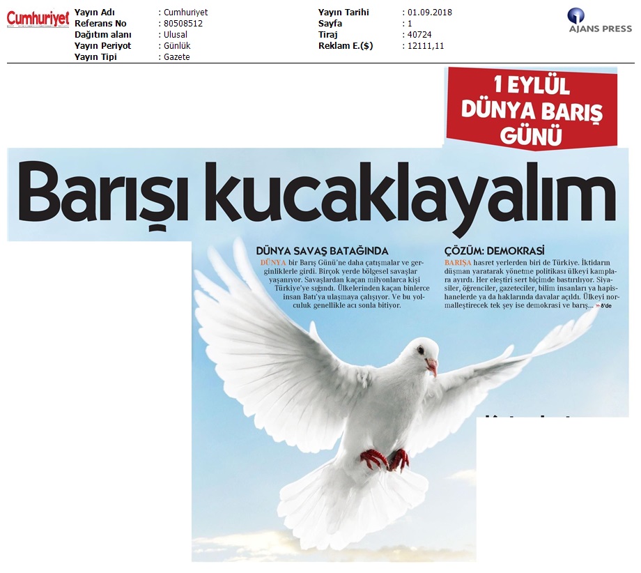 1 Eylül Dünya Barış Günü Gazete Manşetleri!