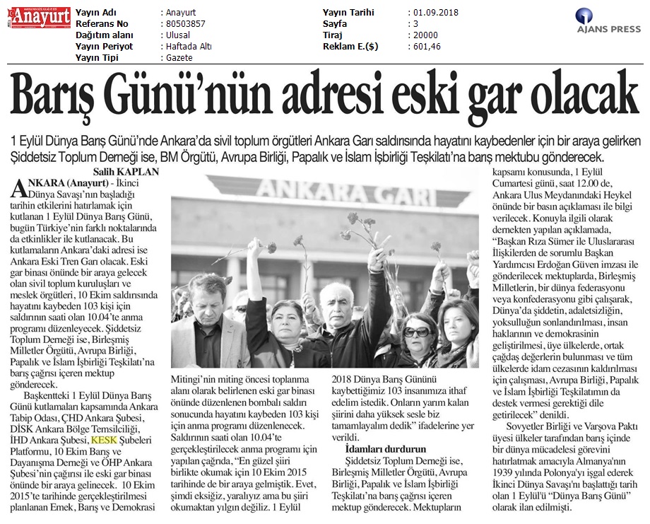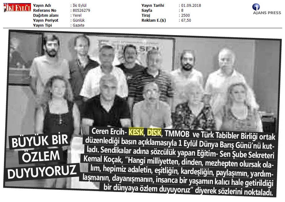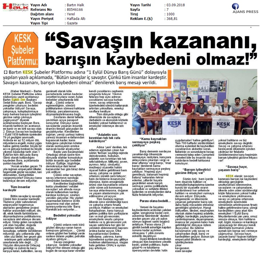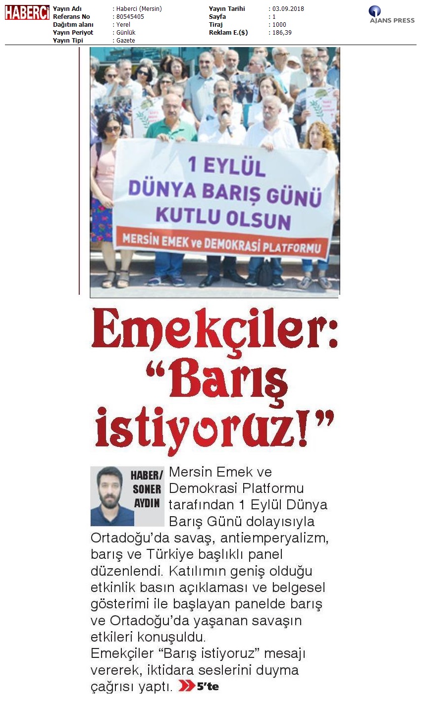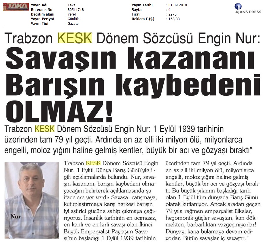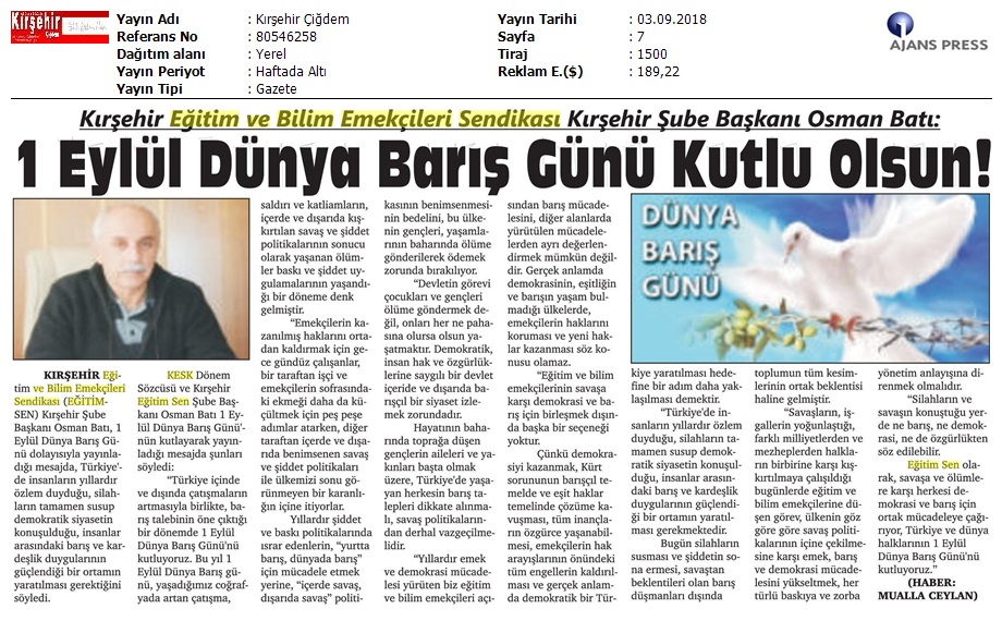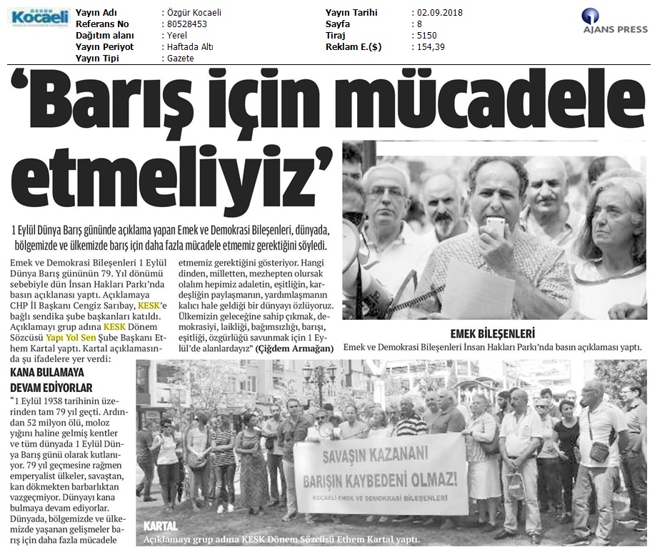1 Eylül Dünya Barış Günü Gazete Manşetleri!