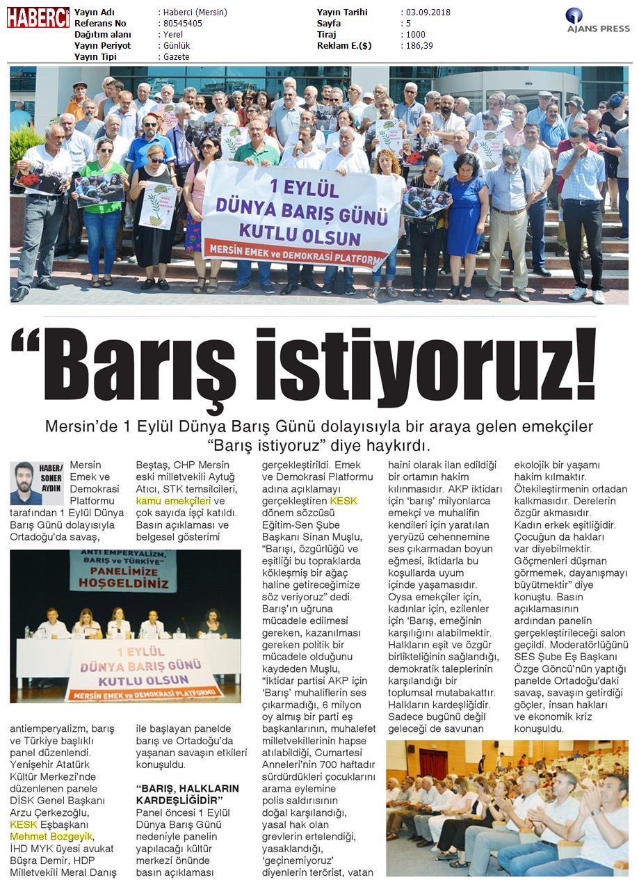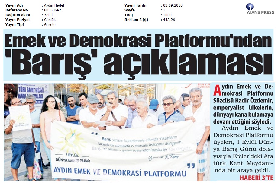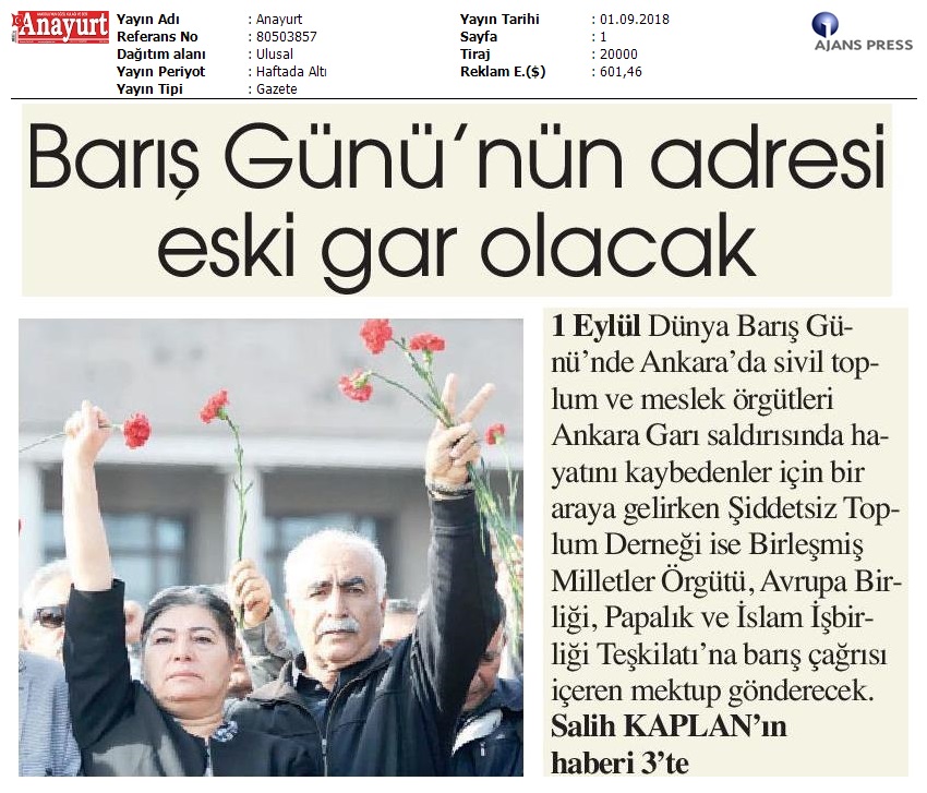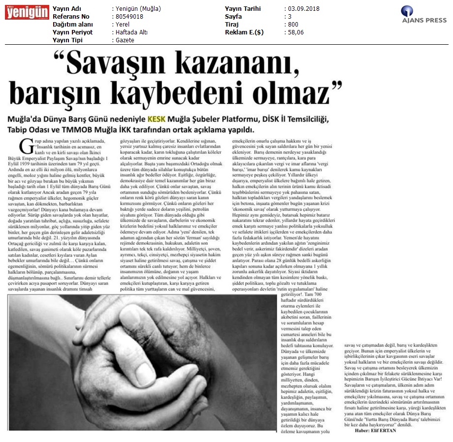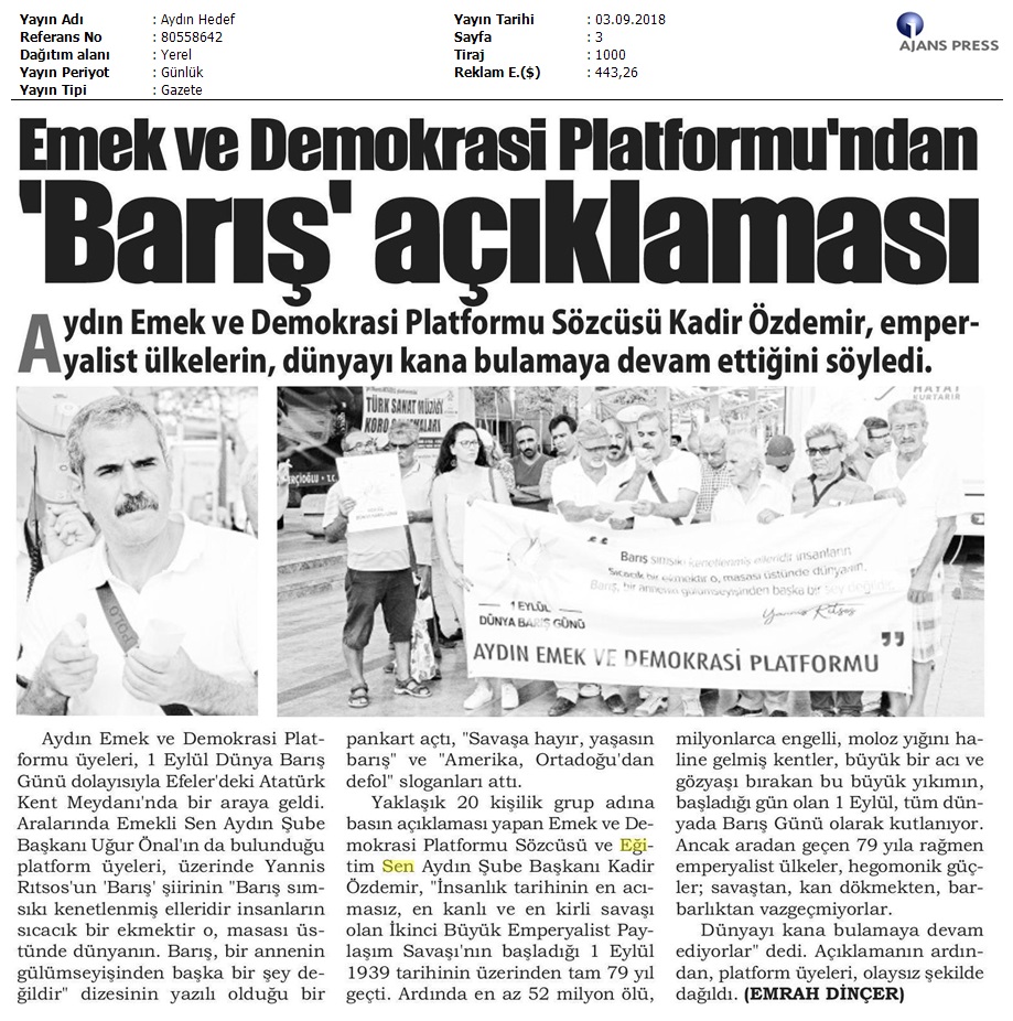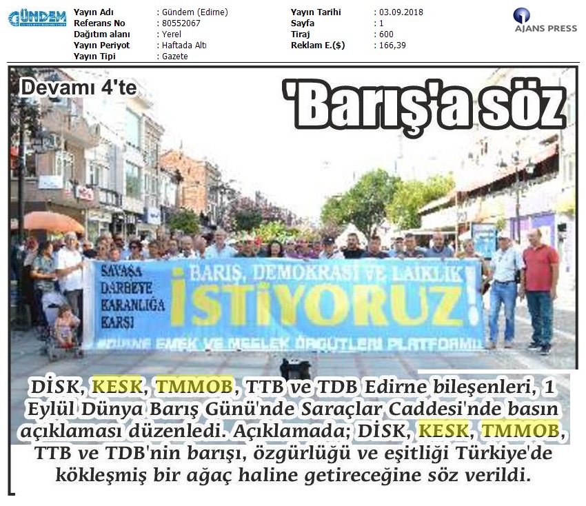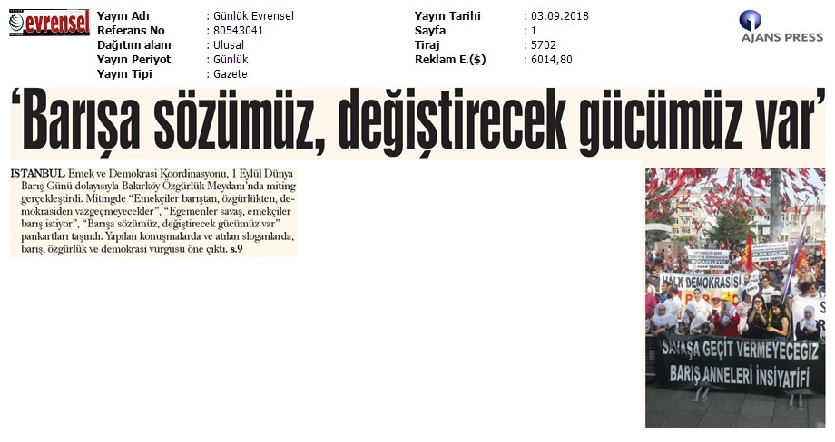 1 Eylül Dünya Barış Günü Gazete Manşetleri!