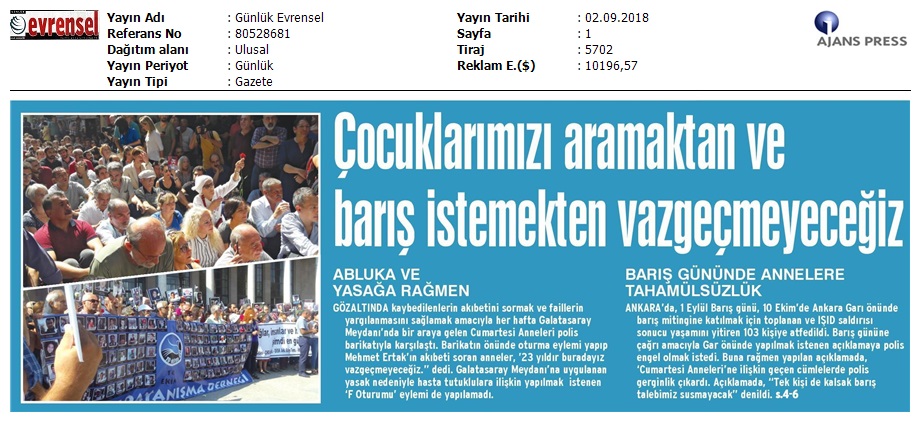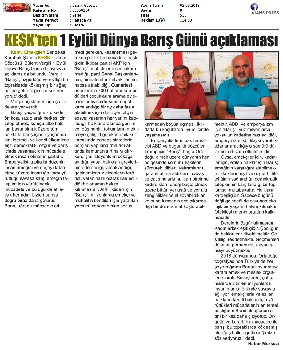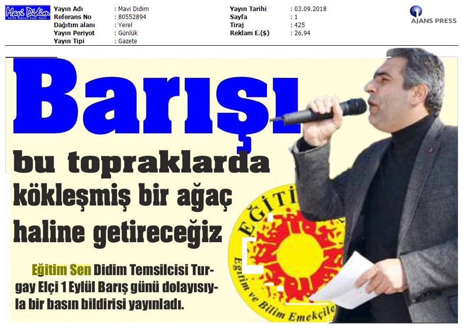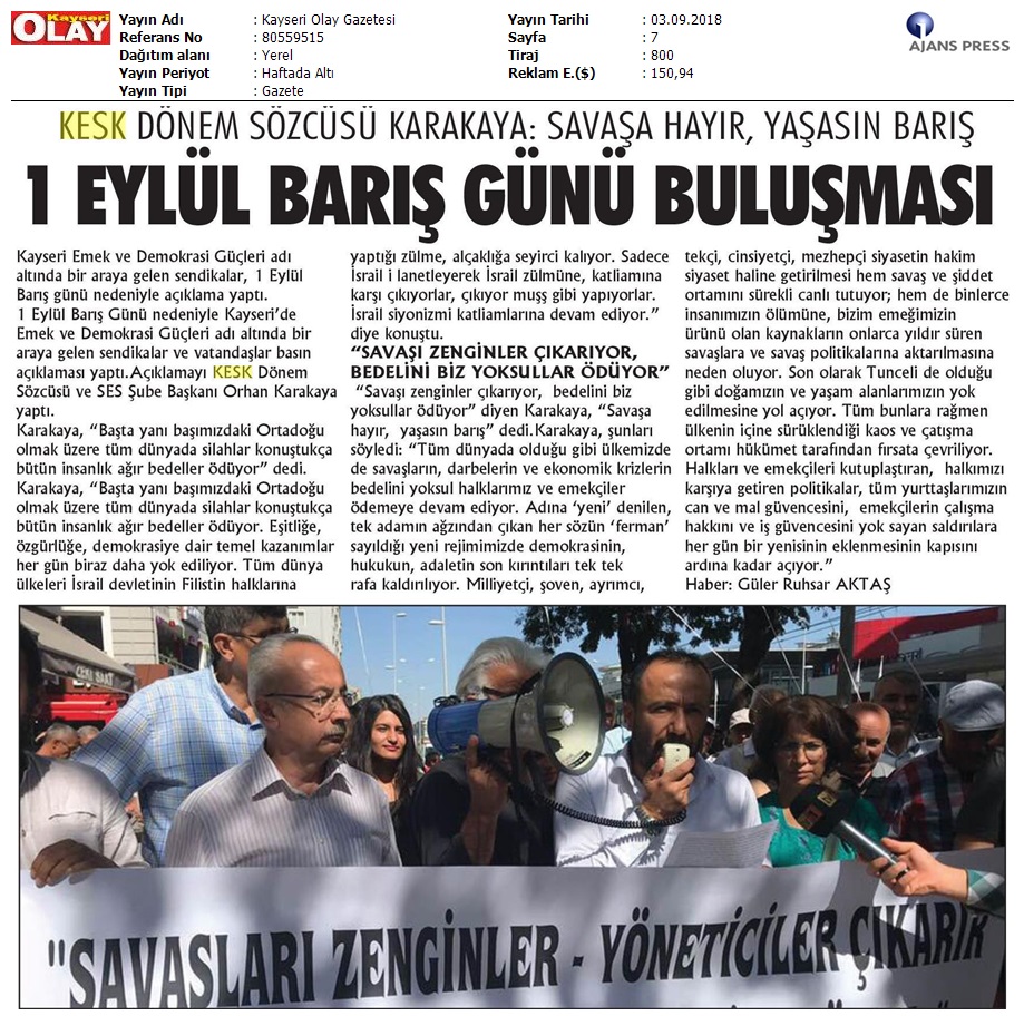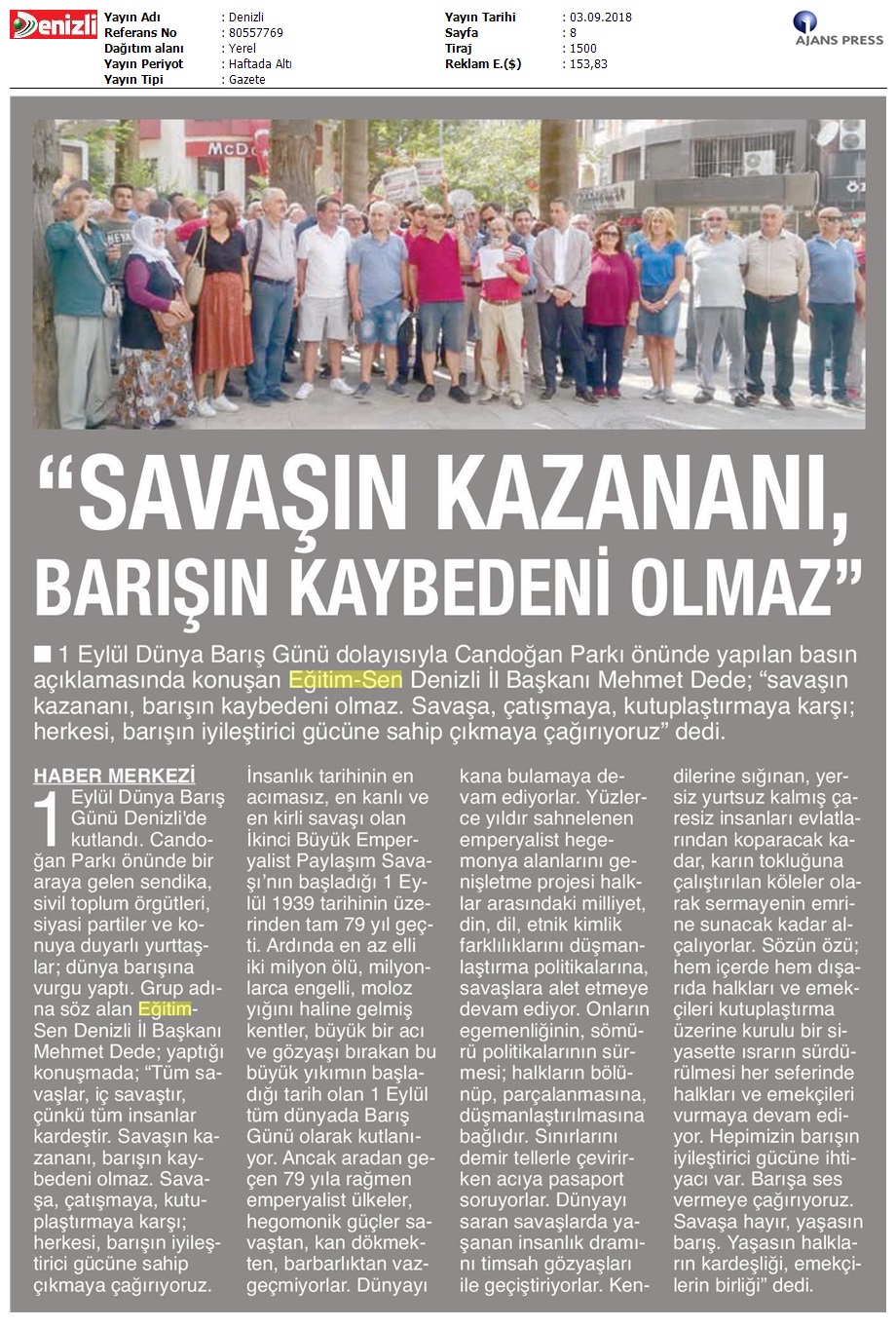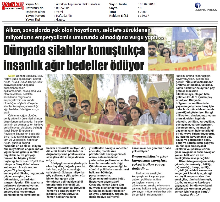 1 Eylül Dünya Barış Günü Gazete Manşetleri!