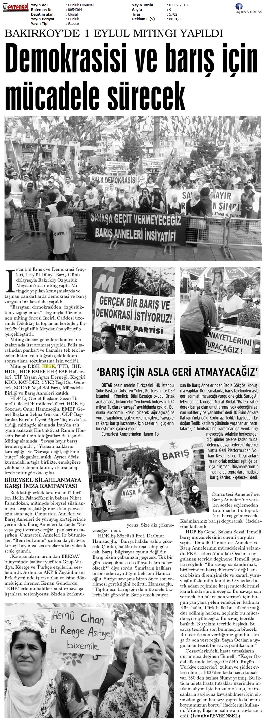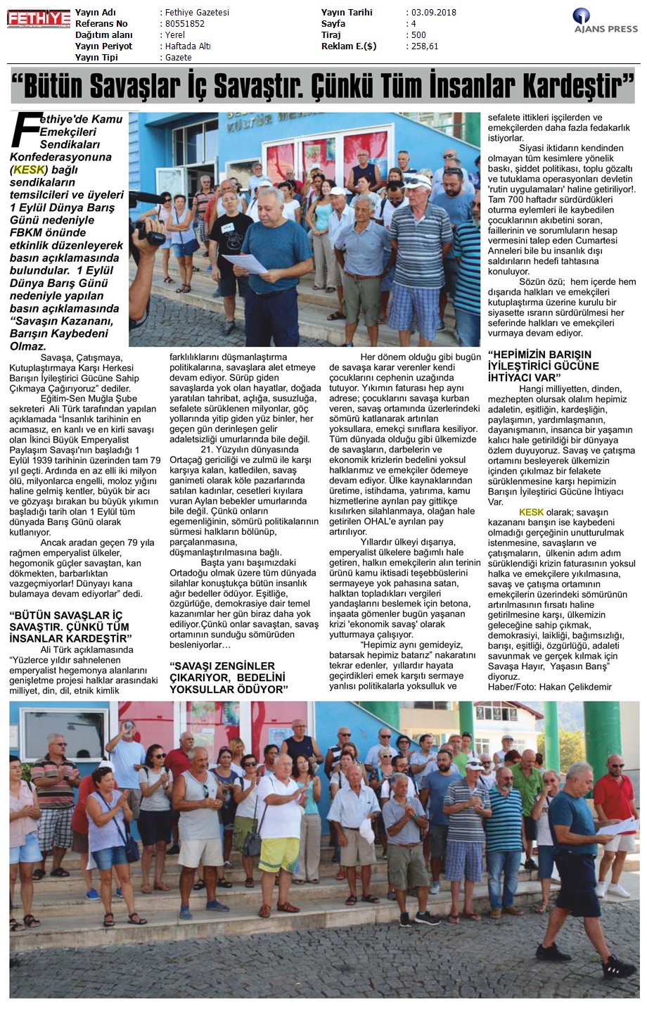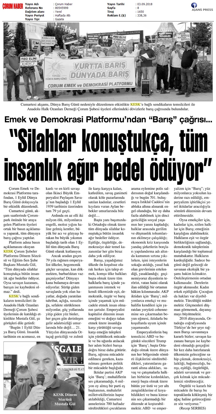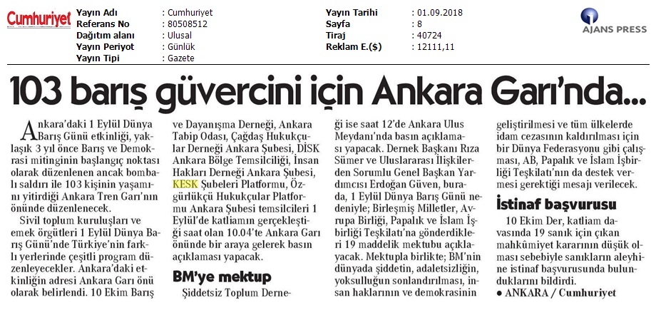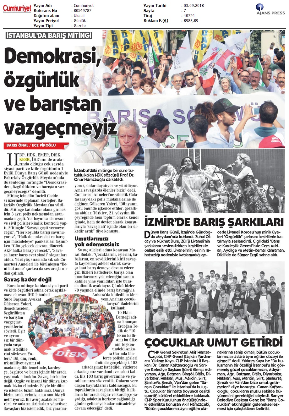 1 Eylül Dünya Barış Günü Gazete Manşetleri!