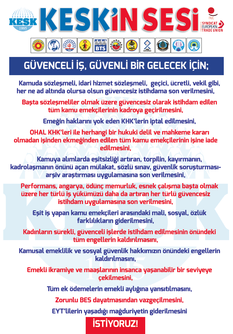 24 Mayıs 2019 Cuma günü, Aile, Çalışma ve Sosyal Hizmetler Bakanlığı önünde, taleplerimiz için bir aradayız!!!KESK’İN SESİ Duvar Gazetesi ve Broşürü indirmek için tıklayınız: