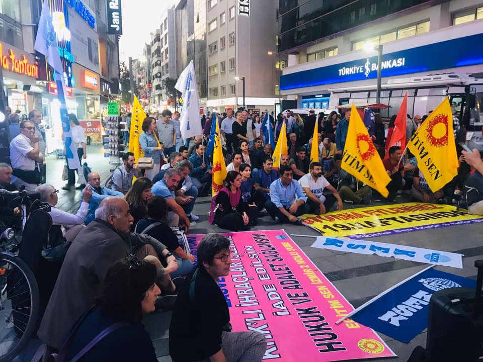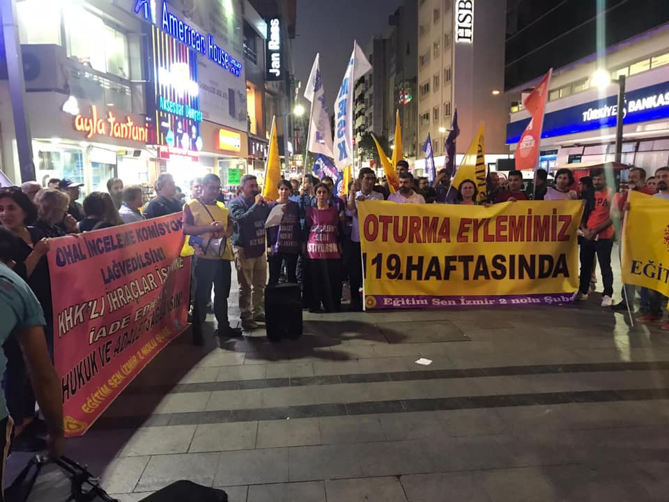 KESK İzmir Şubeler Platformumuz 119. haftasında “İşimi Geri İstiyorum” eyleminde, “KHK’ler gidecek, biz kalacağız” sloganıyla, haksız-hukuksuz ihraçlara karşı mücadeleyi sürdürüyor.
