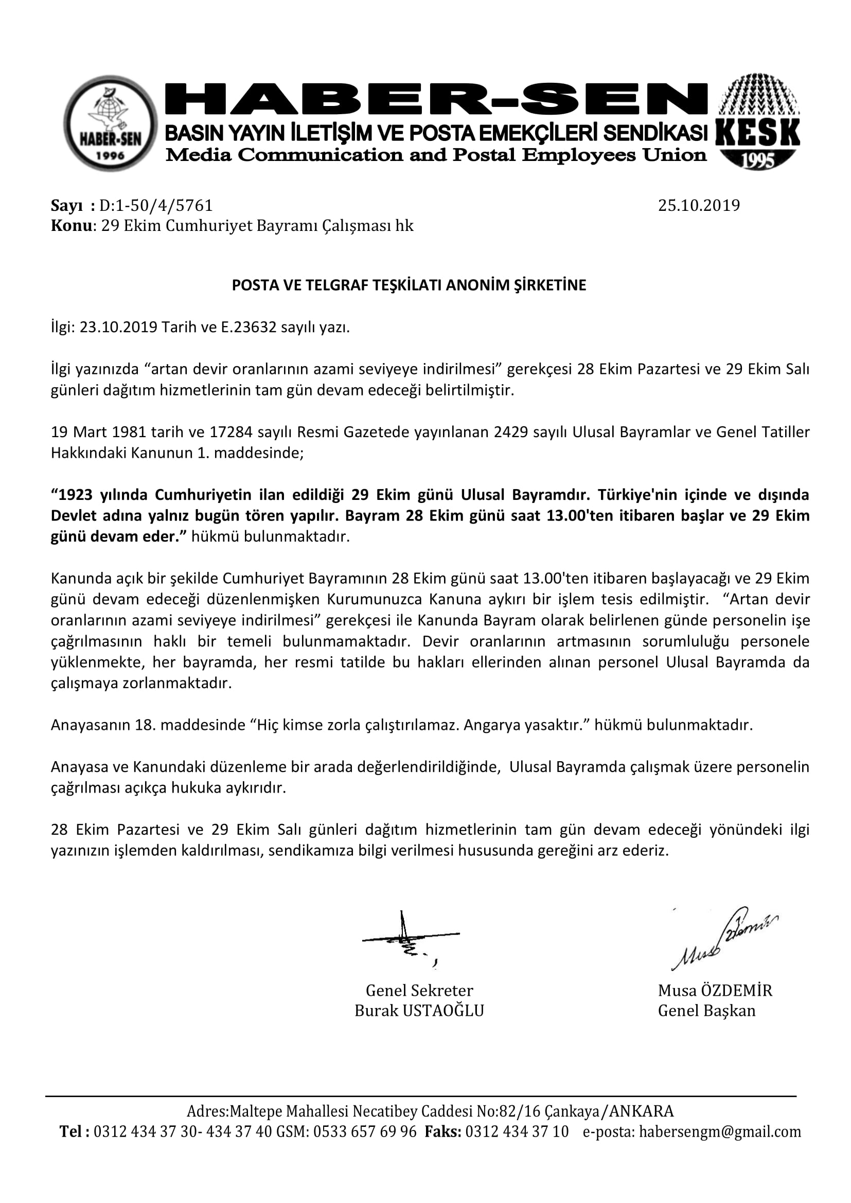 Basın açıklamamızda, 29 Ekim Cumhuriyet Bayramında dağıtım hizmetlerinin devam edeceği yönündeki tebliğ ile ilgili PTT emekçilerinin yaşadığı bu antidemokratik uygulamanın ve hak gaspının son bulmasını, bu amaçla yayınlanan tebliğin geri çekilmesini talep ettik.