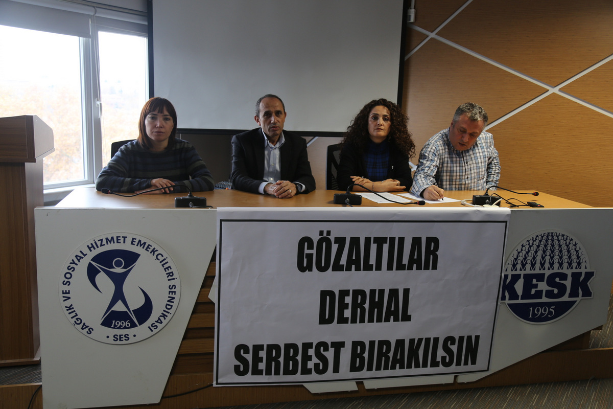 Merkez Yönetim Kurulumuz adına açıklama yapan Eş Genel Başkanımız Gönül Erden şöyle konuştu: “Türkiye’de neredeyse her gün farklı bir kentte emek ve demokrasi alanında faaliyet yürüten kurumların yönetici ve üyelerine yönelik polis baskını, gözaltı ve tutuklamalar yaşanmaktadır. Bugün sabahın erken saatlerinde sendikamızın Merkez Yönetim Kurulu üyesi Fikret Çalağan, eski MYK üyemiz Belkıs Yurtsever, sendikamız üyesi ve eski Adıyaman Milletvekili Behçet yıldırım, İHD Ankara Şube Başkanı Fatin Kanat ile HDP PM ve Ankara il yöneticilerinin de içinde olduğu çok sayıda kişi evlerine yapılan polis baskını sonrası gözaltına alınmışlardır. Soruşturmanın gizliliği ileri sürülerek gözaltına gerekçe yapılan olayla ilgili bilgi verilmemiştir. Ankara’da uzun zamandır benzer soruşturmalar yapılmaktadır. Daha önce yapılan bu soruşturmalara baktığımızda 12 Şubat 2016 günü Ankara Sakarya Caddesi’nde gerçekleştirilen ve kamuoyunda Beyaz Bayrak olarak bilinen basın açıklaması ile ilgili olduğu görülmektedir. O tarihte başta Cizre olmak üzere çok sayıda ilçede sokağa çıkma yasakları devam etmekte ve çok sayıda sivil yaşamları tehlikede olduğu için yardım çağrıları yapmaktaydı. Günlerce, haftalarca, aylarca süren sokağa çıkma yasaklarıyla yüz binlerce insanın, tüm insan haklarının ihlal edildiği bir süreç yaşanmaktaydı. Isınma, su ve gıda gibi en temel ihtiyaçların karşılanamadığı, sağlık hizmetlerine ulaşımın engellendiği, hastanelerin karargâha dönüştürüldüğü, sağlık çalışanlarının yaralıya müdahale ederken, ambulans kullanırken yani yaşatmaya uğraşırken, öldürüldüğü bir ortamdaydık. Ayrıca başta kronik rahatsızlığı olanların, yaşlıların, çocukların, kadınların da sağlık hizmetine erişimi önünde ciddi engeller söz konusuydu. Öyle ki sağlık hizmetine ihtiyaç duyanların ellerinde beyaz bayraklarla hastaneye ulaşma çabaları biz sağlık ve sosyal hizmet emekçilerini de derinden etkilediği için sendikamızın Ankara Şubesi de beyaz bayrak eylemleri ile yaşam hakkına vurgu yapan açıklamalar gerçekleştirmiştir. Bu açıklamaya katılan kişi ve kurumlarda sivillerin yardım çığlığının duyulması, sağlık hizmetine ulaşımın önündeki engellerin kalkması için duyarlılık çağrısı yapıyorlardı. Bu ve benzeri basın açıklamaları bahane edilerek bugüne kadar 100’ün üzerinde insan ile ilgili farklı tarihlerde farklı soruşturma numaraları verilerek benzer soruşturmalar yürütüldü. Bugün Ankara’da yapılan bu gözaltı operasyonunun tahminen bu açıklamalar ile ilişkili olduğunu belirtmek isteriz. İktidarlarını sürdürmek ve faşizan politikalarına meşruiyet kazandırmak için demokratik eylem ve etkinliklere katılmamız yasa dışı faaliyetlermiş gibi sunuluyor. Bir kez daha ifade ediyoruz ki toplantı ve gösteri hakkımızın kullanımı valiliklerin ya da idarecilerin insafına bağlı değildir. Valilerin keyfiliklerine uymak zorunda değiliz. Anayasaya aykırı yasaklara ve talimatlara uyma yükümlülüğümüz yoktur. Gözaltına alınanların tamamının adresleri belli olup çağrılma durumunda ifade verecek kişilerdir. Ancak bu yöntemin uygulanmayıp doğrudan doğruya polis baskını ile gözaltına alma yönteminin uygulanması soruşturmaların aynı zamanda toplumsal muhalefete dönük bir baskı aracı olarak da kullanıldığını göstermektedir. İktidar gözaltı ve tutuklamalar yoluyla muhalif kesimleri sindirmeyi, korku dalgası yaratmayı hedeflediğinden bu politikayı özellikle ve sistematik olarak uygulamaktadır. Hukuk hiçbir dönemde bu kadar ayaklar altına alınmadı, temel hak ve özgürlükler hiçbir dönemde bu denli ihlal edilmedi. Siyasi iktidarı bir kez daha uyarıyoruz; göz altılarla, tutuklamalarla bizleri emek, demokrasi ve barış mücadelesinden alıkoyamayacaksınız. Arkadaşlarımızın gözaltına alınmasını kınıyoruz. Hukuk tanımaz saldırılara son verilmelidir. Gözaltına alınanların biran önce serbest bırakılmasını talep ediyoruz.”