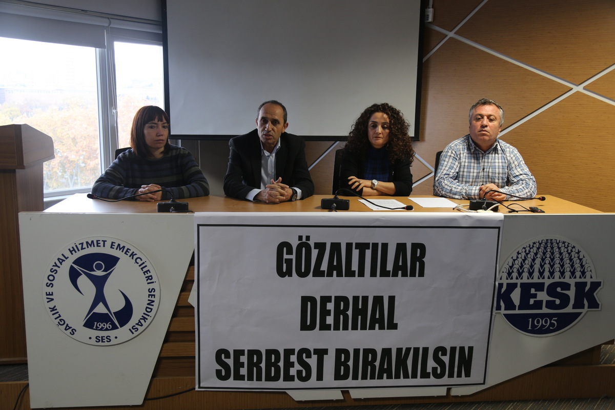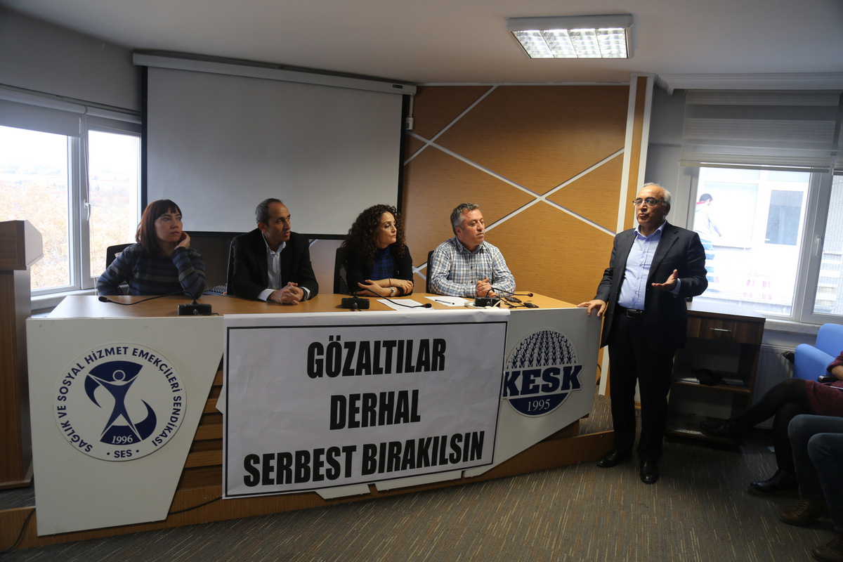 Erden’in ardından konuşan KESK Eş Genel Başkanı Mehmet Bozgeyik de Türkiye’de Anayasalsızlık süreciyle tüm hakların ortadan kaldırıldığına vurgu yaparak, “Özellikle 15 Temmuz’dan itibaren emek ve demokrasi güçleri alışmayacağımız bir baskıyla karşı karşıya. Sendikal hak ve özgürlük mücadelesi yürüten üye ve yöneticilerimiz demokratik haklarını kullandıkları için baskı, gözaltı, işten çıkarılma ve tutuklamalarla karşılaşıyor. KESK olarak baskı politikalarına karşı mücadeleye devam edeceğiz, arkadaşlarımız derhal serbest bırakılsın” diye konuştu.